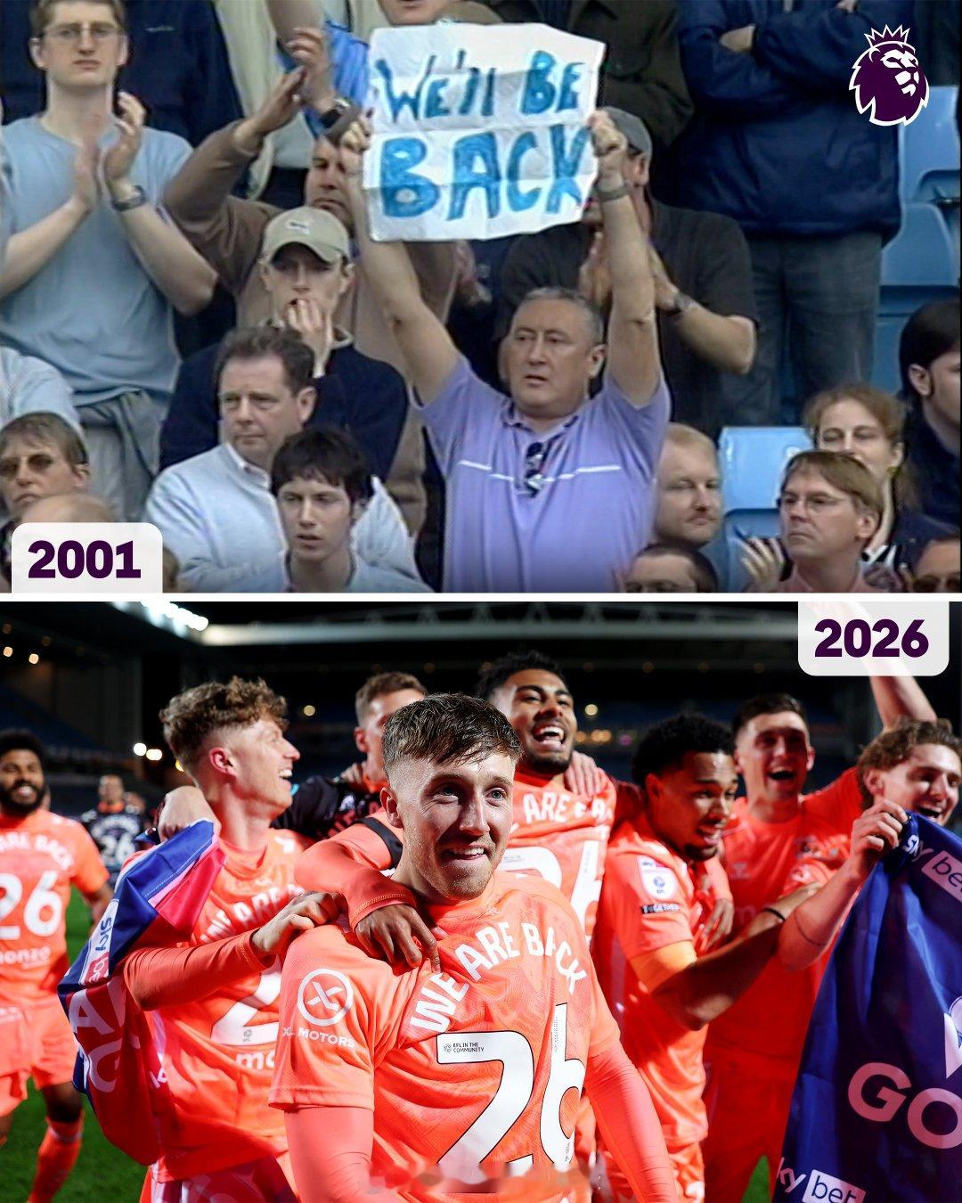 【一等就是25年】2001年5月,英超创始成员俱乐部考文垂,最终确定从英超联赛降级,当时考文垂球迷高举“我们会回来的”的标语。没想到的是,这一等就足足等了25年,直至2026年4月,天蓝军团才确定重返英超。考文垂时隔25年重返英超 兰帕德带队提前3轮升超