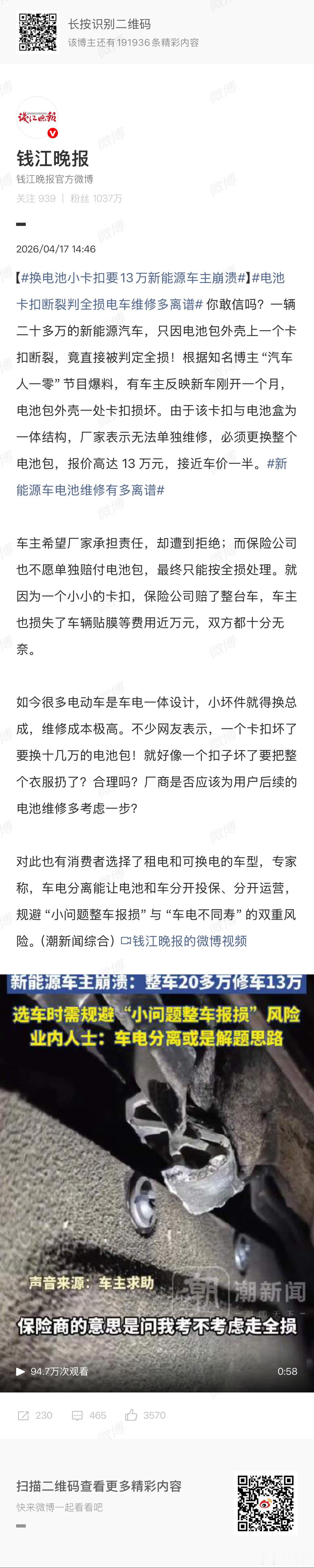 换电池小卡扣要13万新能源车主崩溃 这就是比较典型的设计层面的挖大坑了吧……对厂家来说没啥甚至乐得乎,对买家那就非常刺激了。