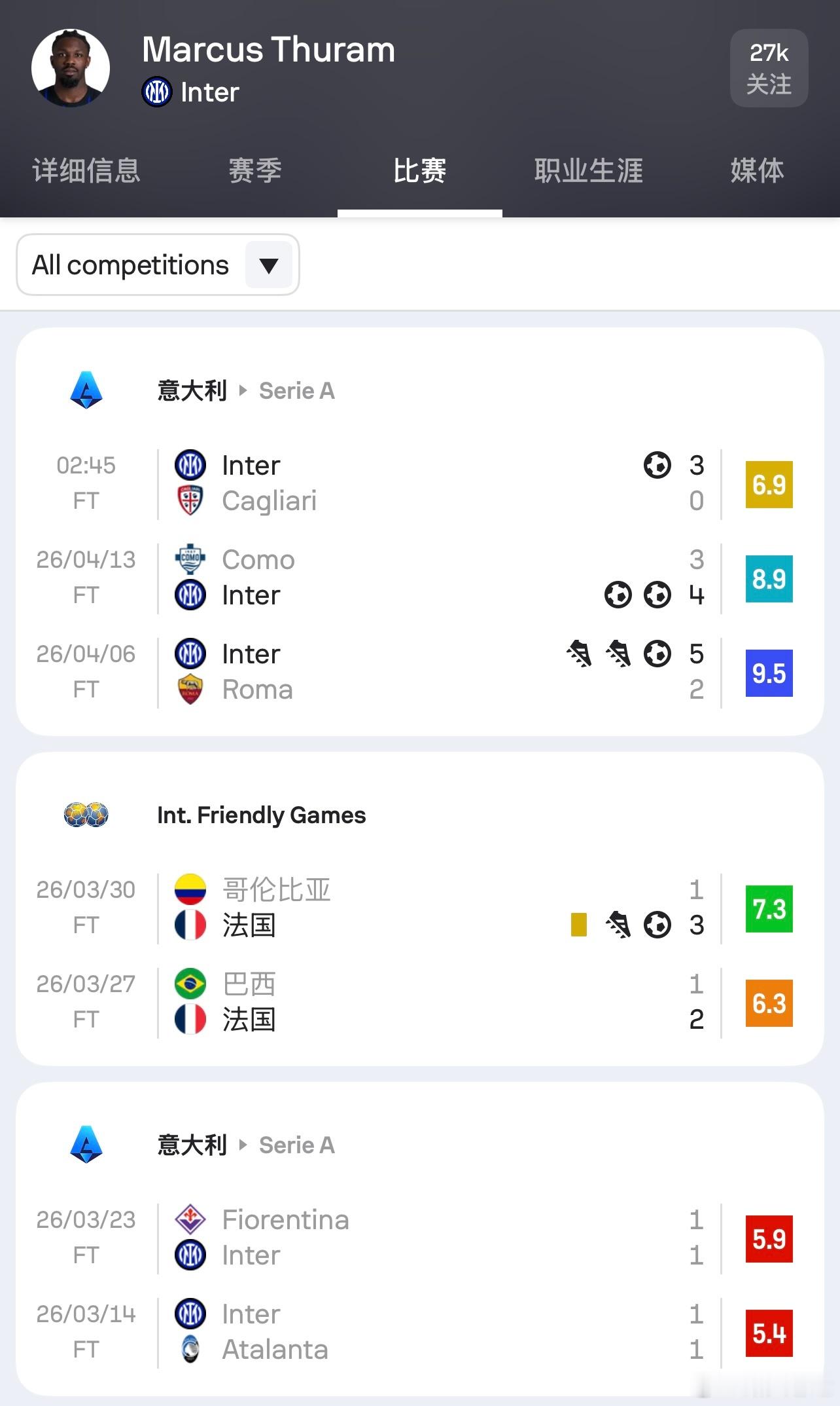 本赛季联赛11球5助,其中4球2助是最近3场完成的,这趟国家队比赛日备不住被敲打了。国际米兰3比0卡利亚里意甲