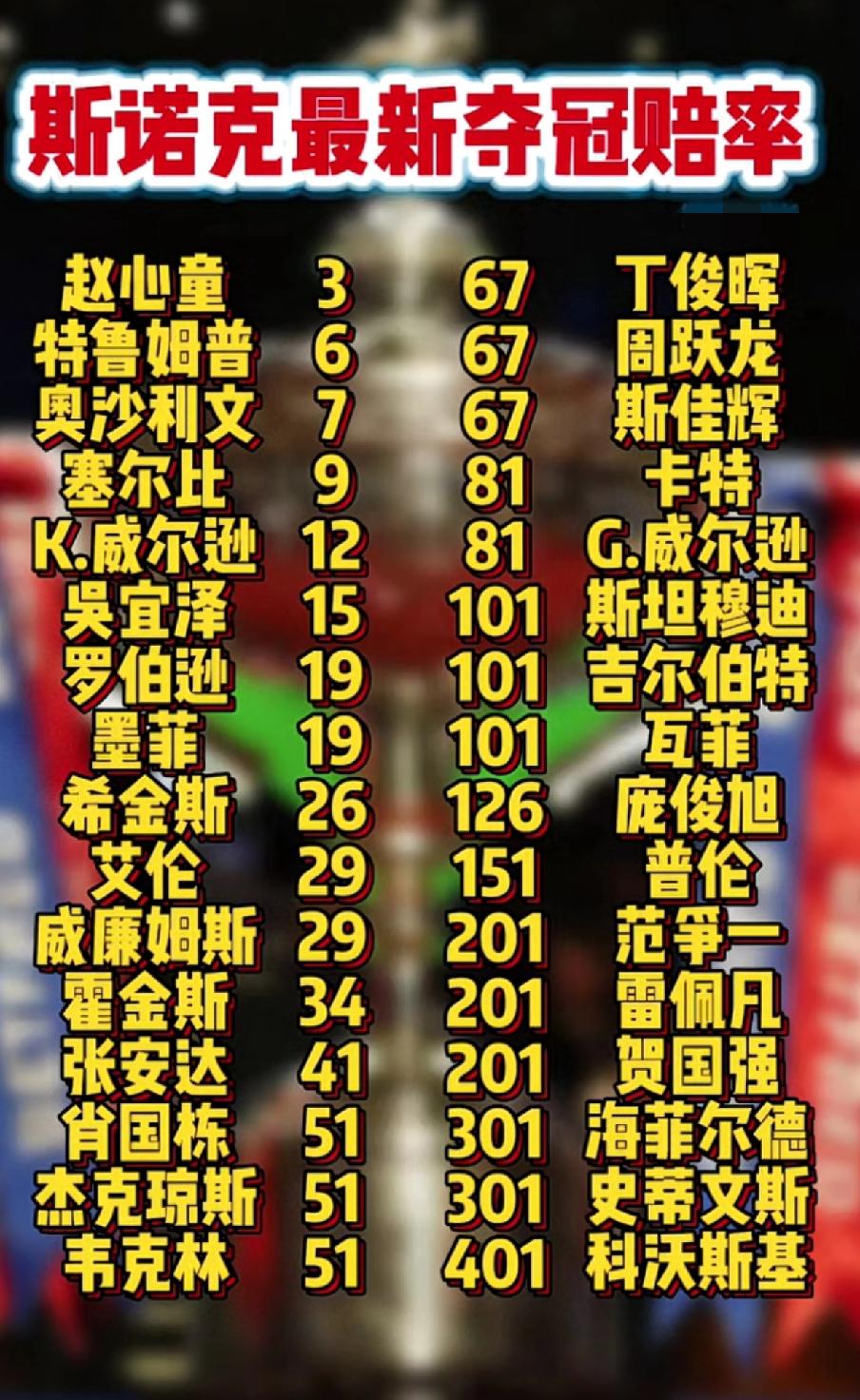 2026年斯诺克世界锦标赛正赛32位选手夺冠概率一览表 斯诺克世界锦标赛今天开始16强的争夺,卫冕冠军是我国选手赵心童。 赵心童目前是本届世锦赛夺冠概率最高选手,我国斯诺克一哥丁俊晖夺冠排在第17位。 下面来看看最新夺冠概率一览表: