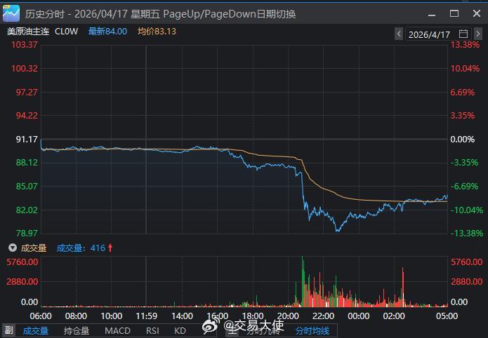 截至4月17日收盘,纽约商品交易所5月交货的轻质原油期货价格下跌10.84美元,收于每桶83.85美元,跌幅为11.45%;6月交货的伦敦布伦特原油期货价格下跌9.01美元,收于每桶90.38美元,跌幅为9.07%。