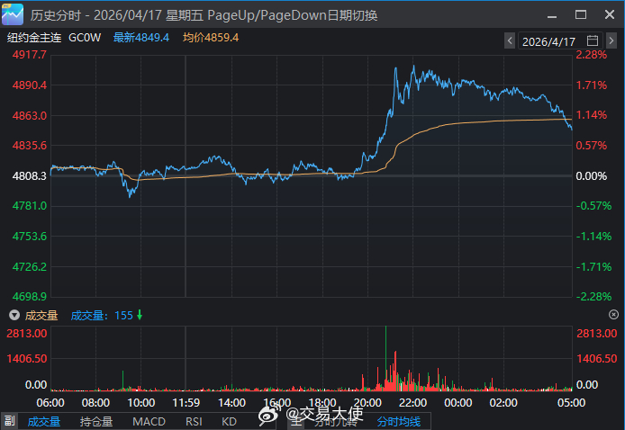 贵金属价格强势上涨。4月17日,伦敦现货黄金涨1.05%,报4837.49美元/盎司,本周累计上涨1.91%。COMEX黄金期货涨0.85%,报4849.4美元/盎司,本周累涨1.3%。