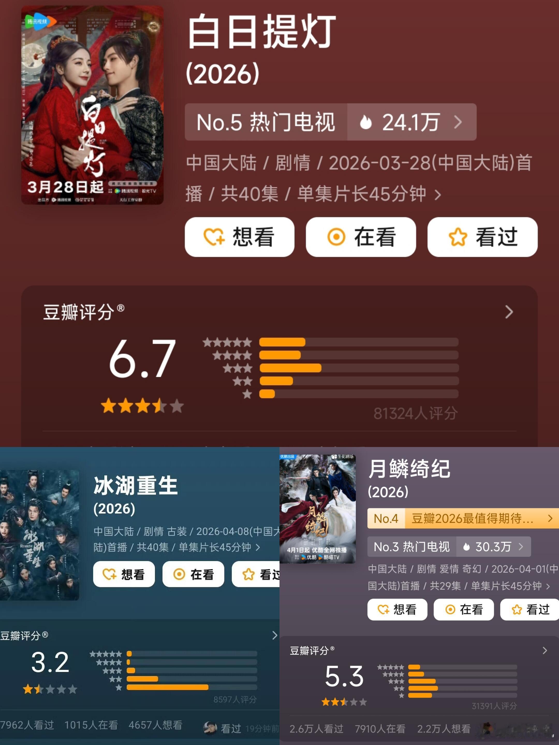 最近在播的三部剧开分了,符合预感嘛?白日提灯 6.7分月鳞绮纪 5.3分冰湖重生 3.2分