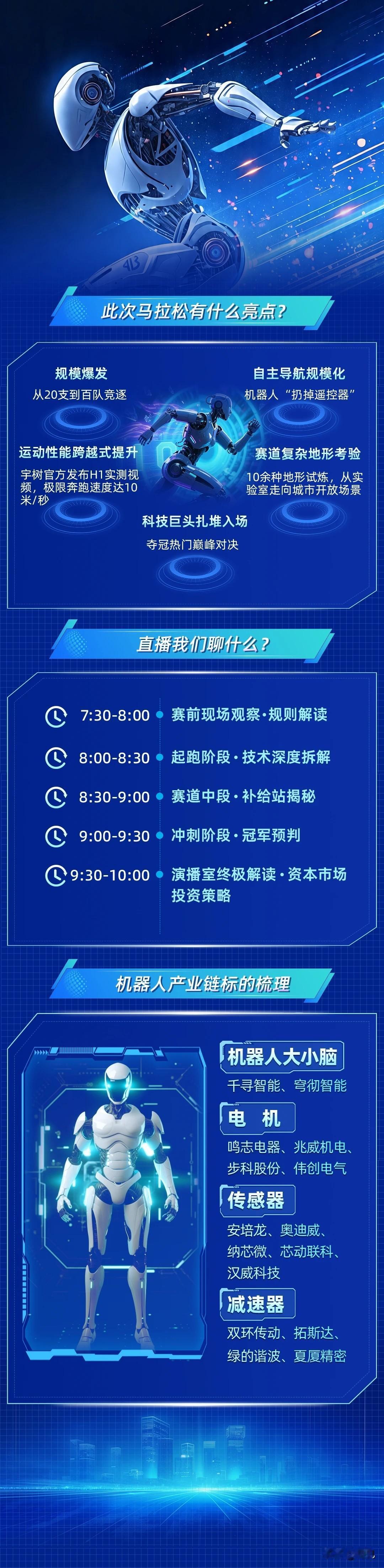 人形机器人半马鸣枪在即!全产业链受益股全景梳理! 4月19日,2026北京亦庄人形机器人半程马拉松即将鸣枪开跑。赛事规模从去年20余支队伍暴增至超300台机器人参赛,运动性能实现跨越式提升,自主导航技术也逐步规模化,标志着人形机器人正从实验室走向城市开放场景,产业链各环节需求持续爆发,相关标的迎来直接催化。 个股梳理分析 1. 千寻智能:作为人形机器人大小脑环节的核心标的,专注智能控制与感知系统研发,深度受益于本次赛事对机器人导航、运动控制技术的验证与推广,赛道成长逻辑清晰。 2. 穹彻智能:聚焦人形机器人智能控制系统,提供高性能运动控制与算法解决方案,本次赛事中机器人自主导航的规模化应用,将带动公司产品需求与市场关注度提升。 3. 鸣志电器:人形机器人电机环节龙头企业,伺服电机产品广泛应用于机器人关节驱动,本次赛事对机器人运动性能的高要求,将推动公司电机技术迭代与订单增长。 4. 兆威机电:专注微型传动系统与精密电机研发,产品可应用于人形机器人关节驱动场景,受益于人形机器人产业加速落地,赛道景气度持续提升。 5. 步科股份:工业自动化与伺服系统核心供应商,为人形机器人提供运动控制与驱动解决方案,本次赛事展现的机器人性能突破,将带动公司相关业务需求增长。 6. 伟创电气:聚焦工业变频器与伺服驱动系统,产品可适配人形机器人关节驱动场景,受益于人形机器人赛道热度提升,订单与技术迭代有望加速。 7. 安培龙:传感器环节核心标的,压力、温度传感器产品可应用于人形机器人环境感知系统,本次赛事复杂地形考验,将推动公司传感器产品的市场应用与技术优化。 8. 奥迪威:专注传感器与智能控制方案,产品可应用于人形机器人的距离、压力感知场景,受益于人形机器人产业落地加速,赛道成长空间广阔。 9. 纳芯微:模拟与混合信号芯片龙头,传感器信号调理芯片可应用于人形机器人感知系统,本次赛事对机器人感知性能的验证,将带动公司相关产品需求增长。 10. 芯动联科:高性能MEMS传感器供应商,产品可应用于人形机器人姿态感知与运动控制场景,受益于人形机器人产业发展,订单与技术迭代有望提速。 11. 汉威科技:气体与环境传感器龙头,产品可适配人形机器人环境感知需求,本次赛事推动机器人场景化落地,将带动公司传感器产品的市场应用拓展。 12. 双环传动:减速器环节龙头企业,精密减速器产品是人形机器人关节的核心部件,本次赛事中机器人运动性能的提升,将带动公司减速器产品的市场需求增长。 13. 拓斯达:工业机器人与自动化设备供应商,减速器与伺服系统可应用于人形机器人关节驱动,受益于人形机器人赛道热度提升,业务成长空间广阔。 14. 绿的谐波:谐波减速器龙头,产品是人形机器人关节的核心传动部件,本次赛事中机器人运动性能的突破,将推动公司谐波减速器产品的市场应用与订单增长。 15. 夏厦精密:专注精密传动部件与减速器研发,产品可应用于人形机器人关节传动场景,受益于人形机器人产业加速落地,赛道景气度持续提升。 16. 宇树科技:本次人形机器人半马赛事的核心参赛方,发布的H1人形机器人极限奔跑速度达10米/秒,是国内人形机器人运动性能的标杆企业,赛事表现将直接带动公司品牌影响力提升,核心供应链企业同步受益。 17. 汇川技术:国内工业自动化绝对龙头,伺服系统、控制器产品可全面覆盖人形机器人运动控制需求,已推出适配人形机器人的关节模组与全栈控制系统,技术壁垒深厚,人形机器人产业爆发将打开公司第二增长曲线。 18. 三花智控:全球热管理龙头,深度布局人形机器人执行器、旋转关节模组业务,是特斯拉Optimus核心供应商,线性关节市占率领先,具备规模化量产能力,人形机器人从实验室走向场景化落地,将带动公司相关业务持续放量。 总结 整体来看,本次人形机器人半程马拉松赛事,不仅是行业技术成果的集中展示,更是人形机器人从实验室走向规模化场景落地的重要里程碑。赛事所验证的运动性能、自主导航、环境感知等核心能力,直接对应着人形机器人全产业链的四大核心环节——智能大脑、驱动电机、环境传感器、精密减速器,本次梳理的这些龙头企业,均在各自细分赛道实现了技术突破与商业化落地,是本次赛事最直接的受益标的。 从产业逻辑来看,人形机器人正处于从“技术验证”到“量产落地”的关键拐点,本次赛事的规模化参赛与性能飞跃,将进一步加速行业技术迭代与下游需求释放,相关产业链龙头企业将迎来订单与估值的双重提升,人形机器人赛道也将成为A股市场中长期最具确定性的成长主线之一。 本文涉及资讯内容来自网络公共信息,仅供参考不构成投资建议!