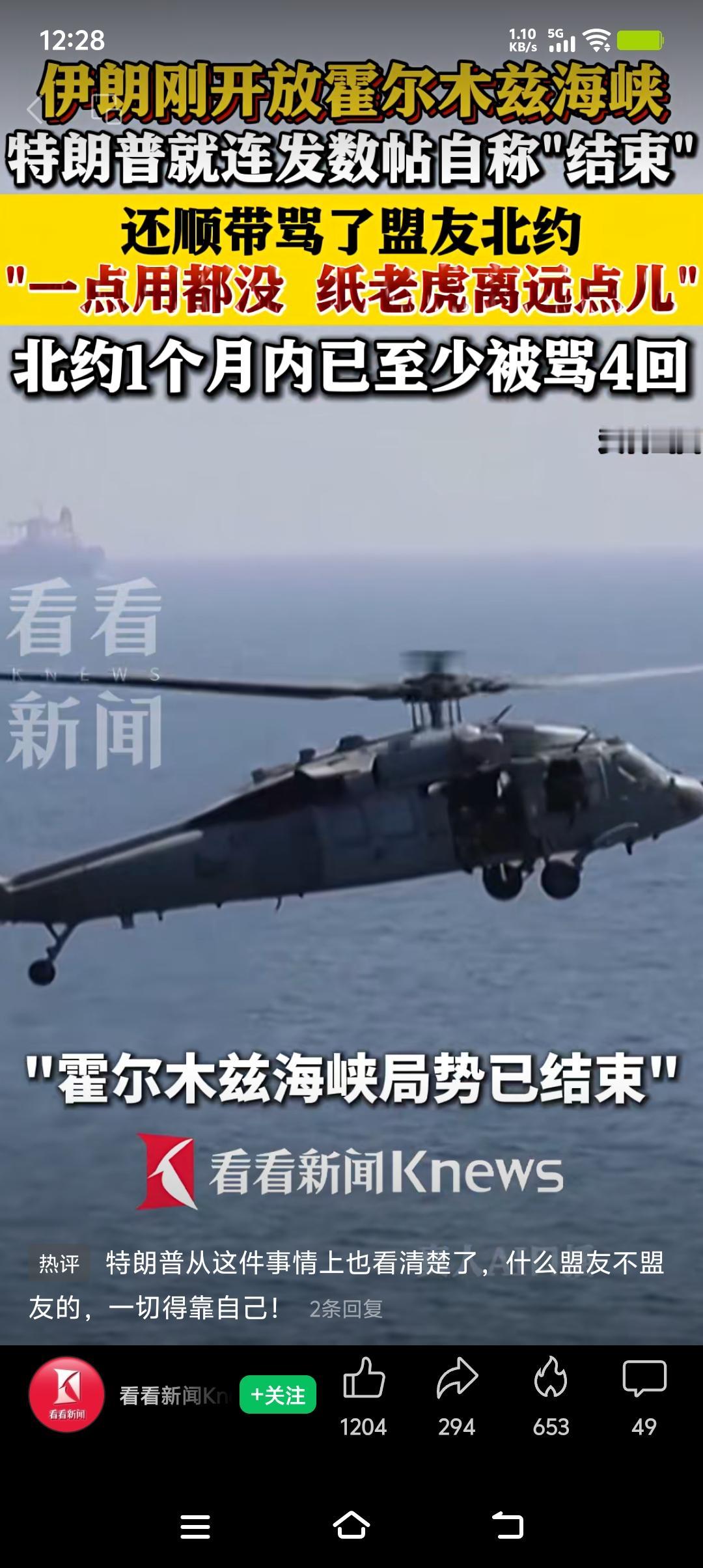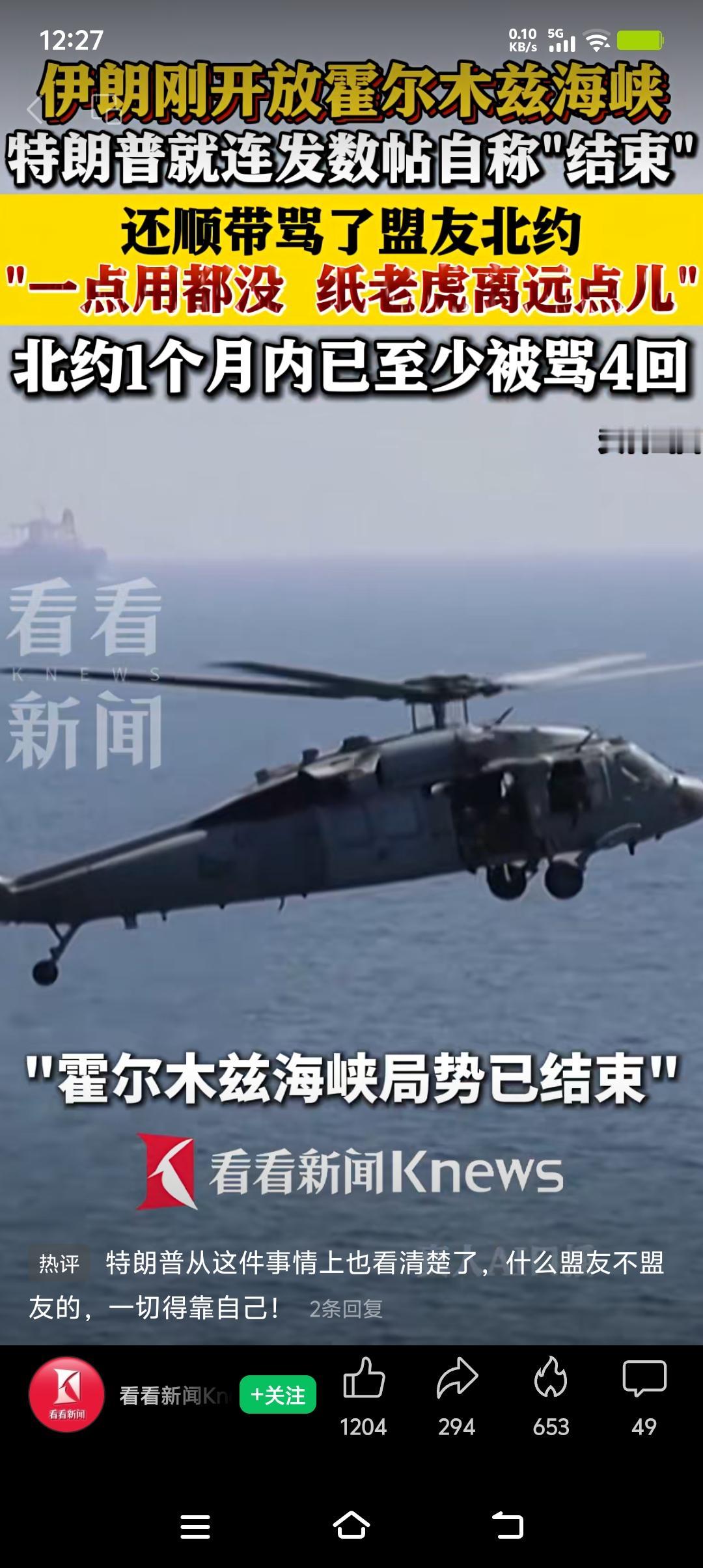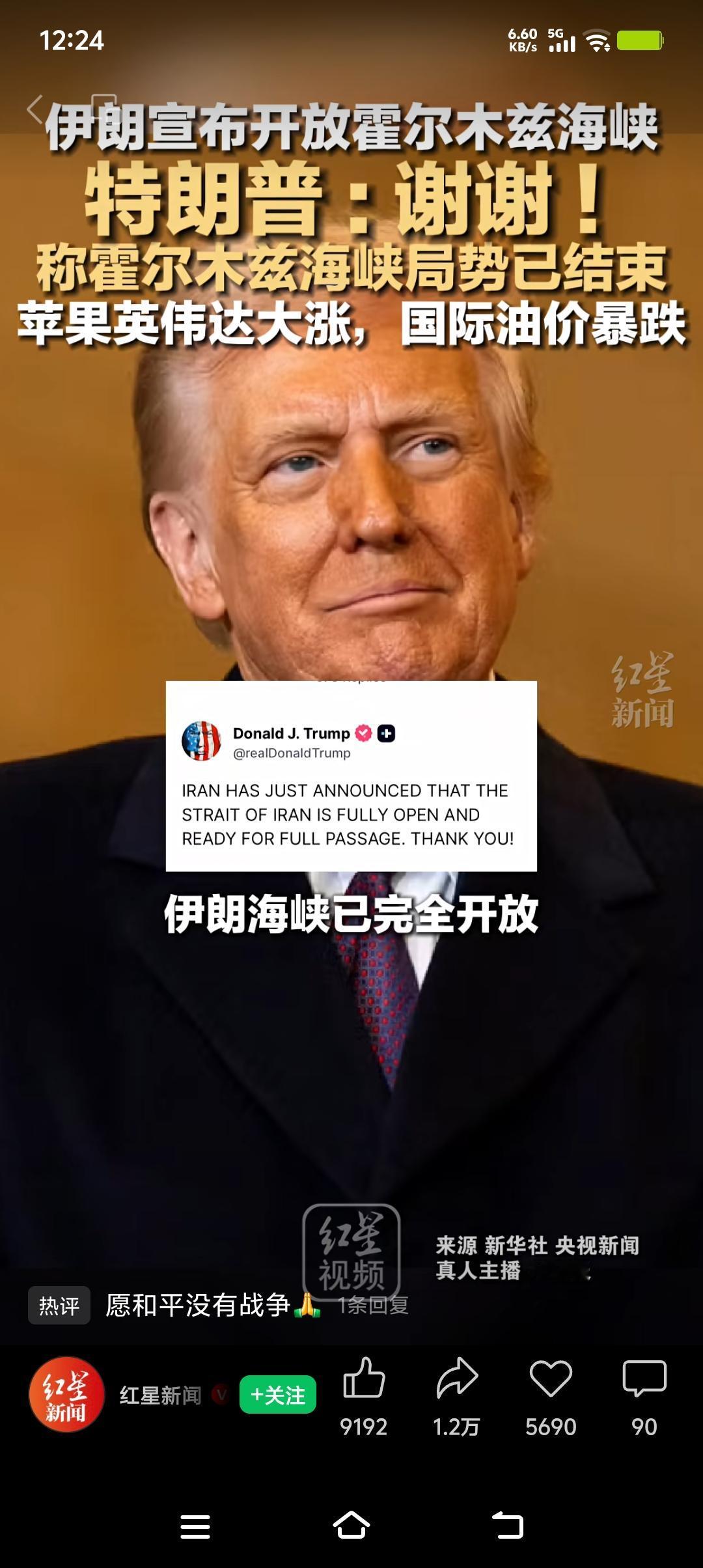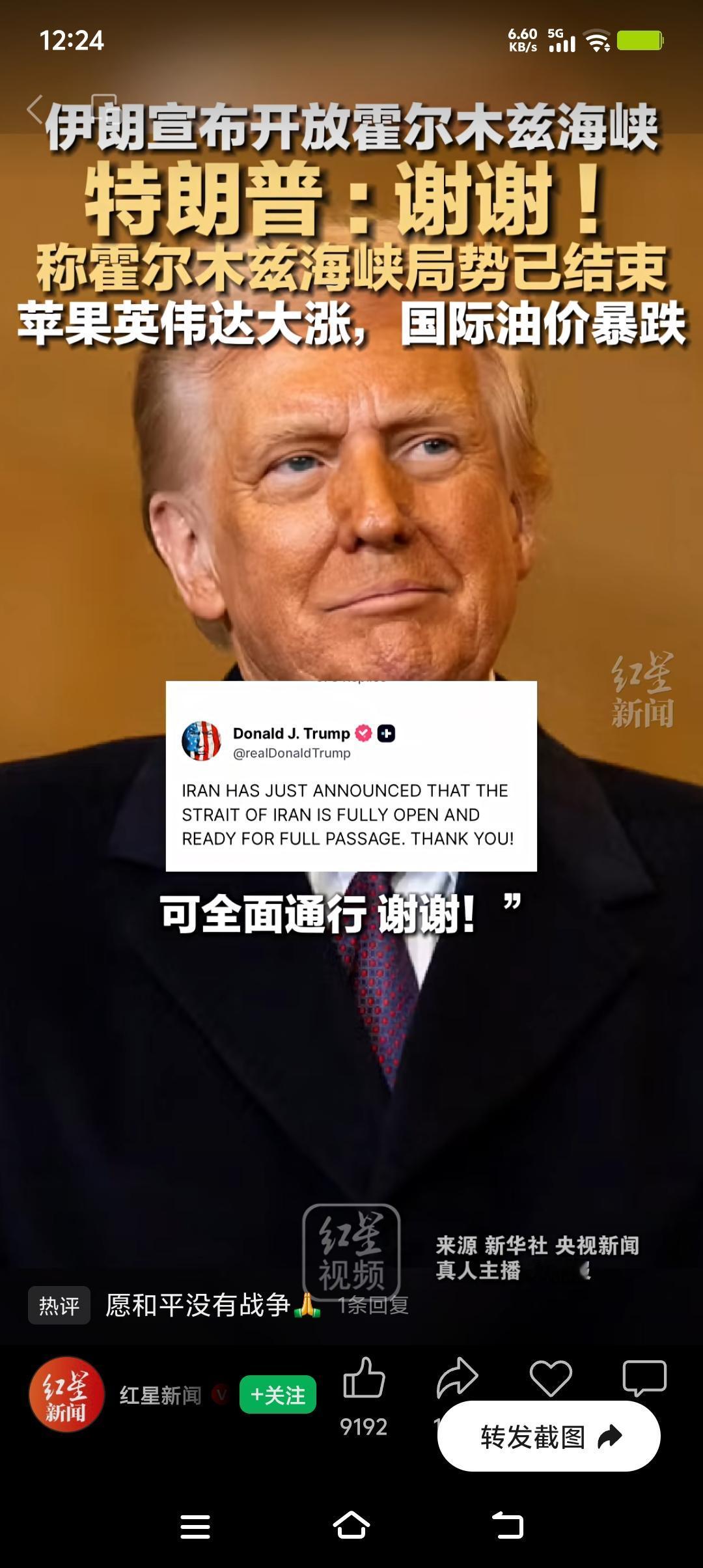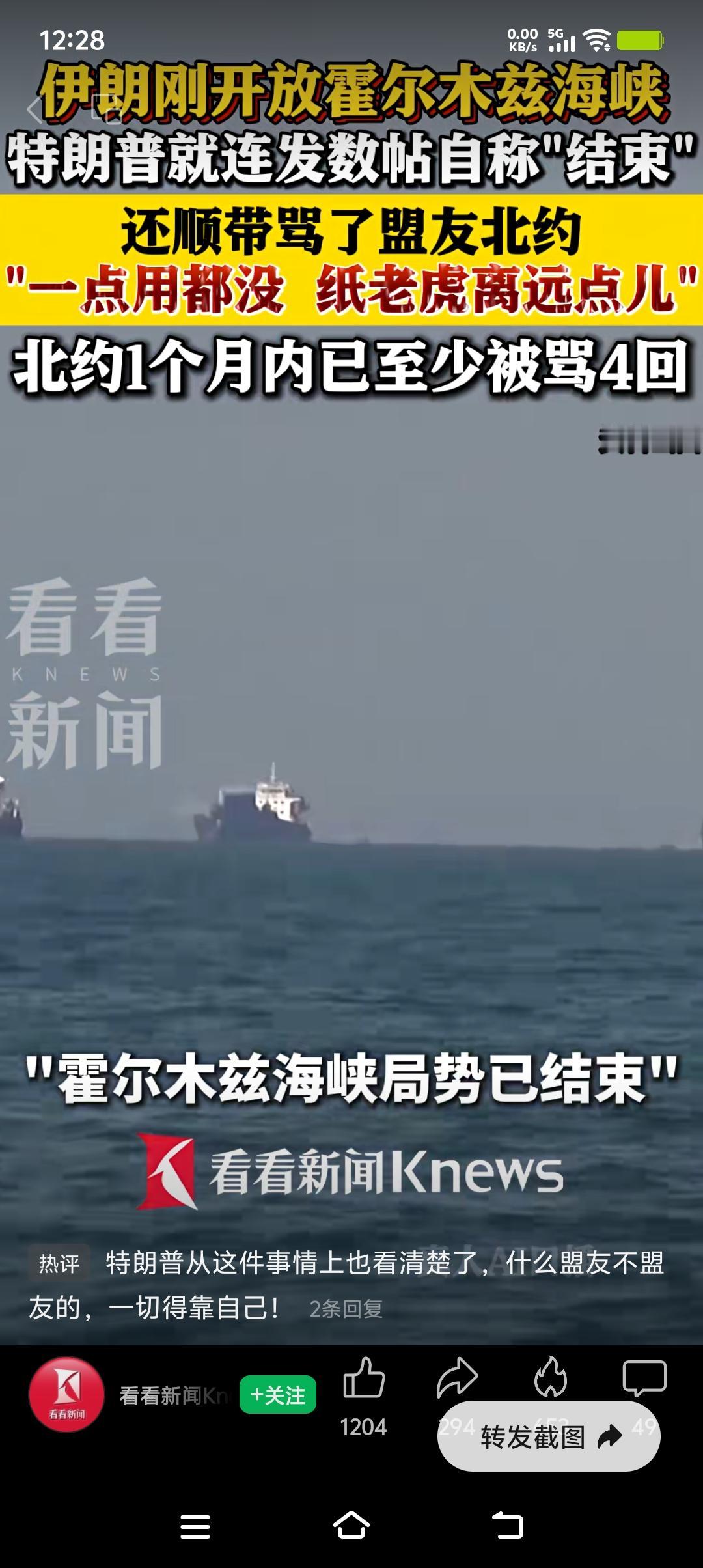 特朗普称霍尔木兹海峡局势已结束,这说法挺有意思。从他连发10帖透露的信息来看,他似乎在彰显美国在其中的主导作用,像说美国协助伊朗清除水雷,还禁止以色列轰炸黎巴嫩。 不过,他批评北约“毫无作用”,称其为“纸老虎”,这背后或许是美国与北约在利益上的分歧。北约询问协助,特朗普却怀疑其动机是运石油。 霍尔木兹海峡战略意义重大,商船通行关乎全球能源运输。特朗普这么说虽然有给自己贴金之嫌,但局势若真缓和,对全球贸易和能源市场稳定是好事。 声明:(借用网络视频图)