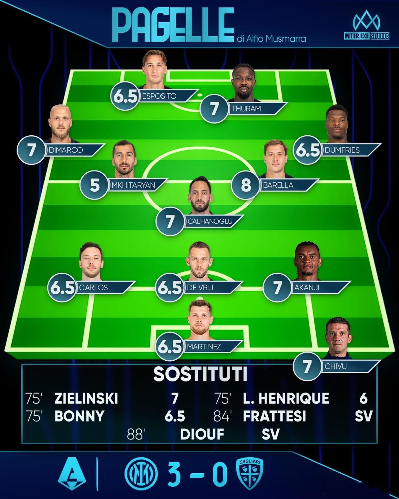 国际米兰3比0卡利亚里,记者穆斯马拉赛后评分!国际米兰意甲国际米兰3比0卡利亚里