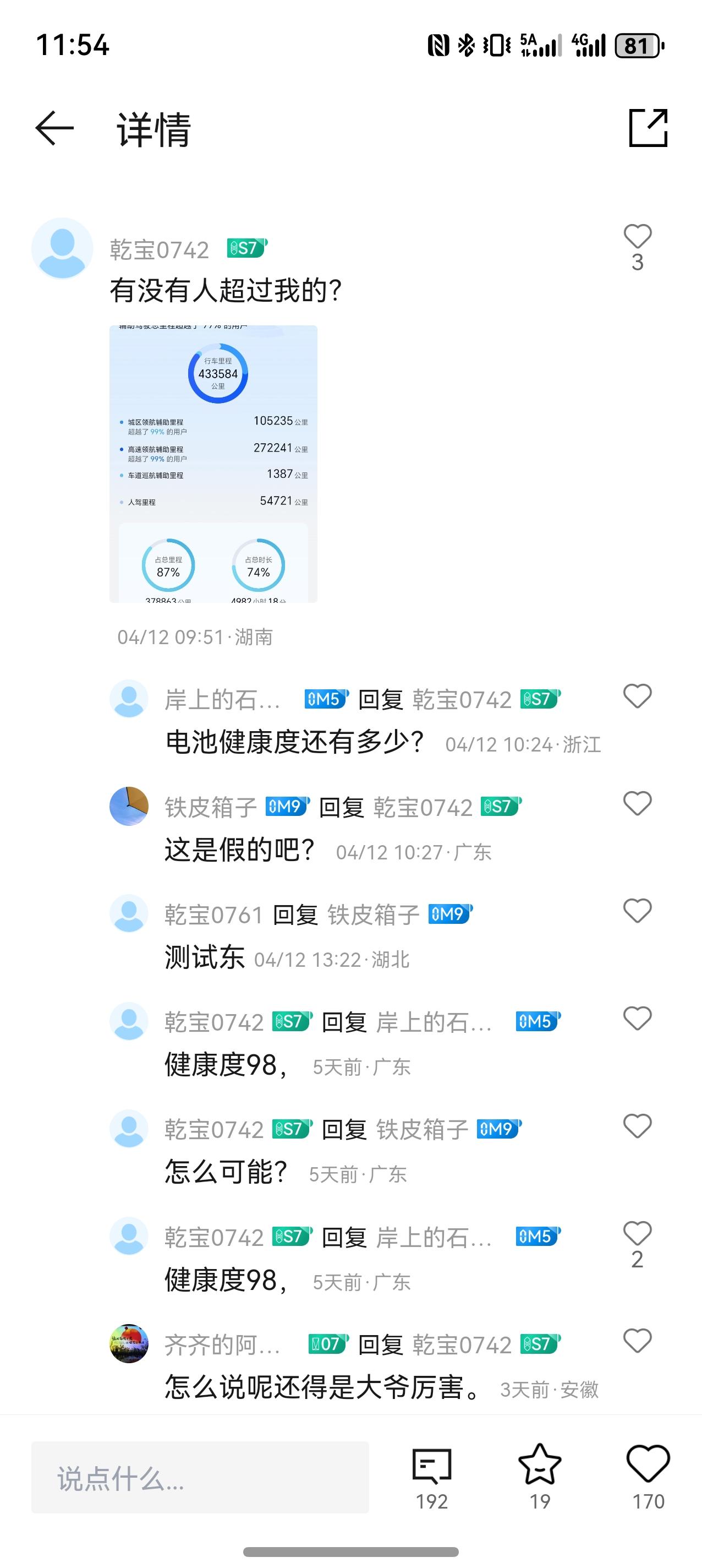 老有人在评论区说,华系车除了智驾还有啥? 智驾是华系车的标签,是最大的竞争力,这已经是公认的事实,无需多言,但因为智驾太强,也掩盖了其他方面的优势。 一位智界S7车主已经安全行驶了43万公里,其中智驾里程超过37万。有人问他跑了这么久,电池健康度如何,他的回答是98%。 这说明了华为巨鲸电池平台的安全性,可靠性,稳定性都是一流的,依靠华为质量标准出厂的车也是值得信赖的。 这是华系车除智驾之外的另一个巨大优势。