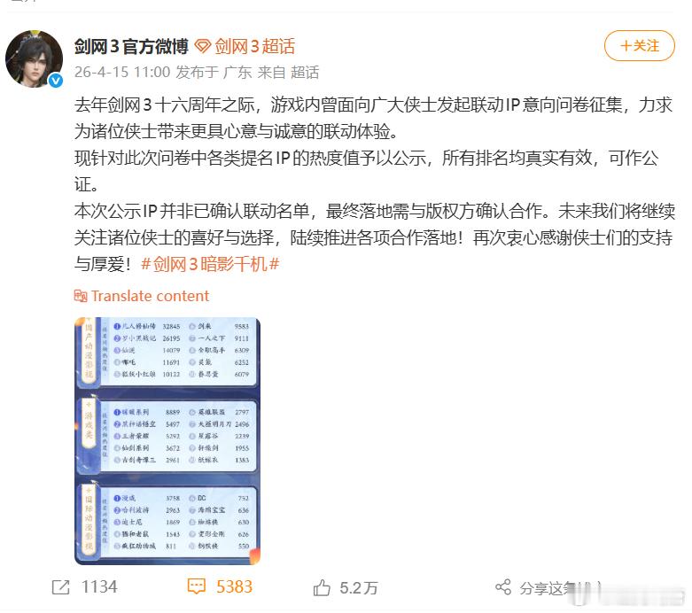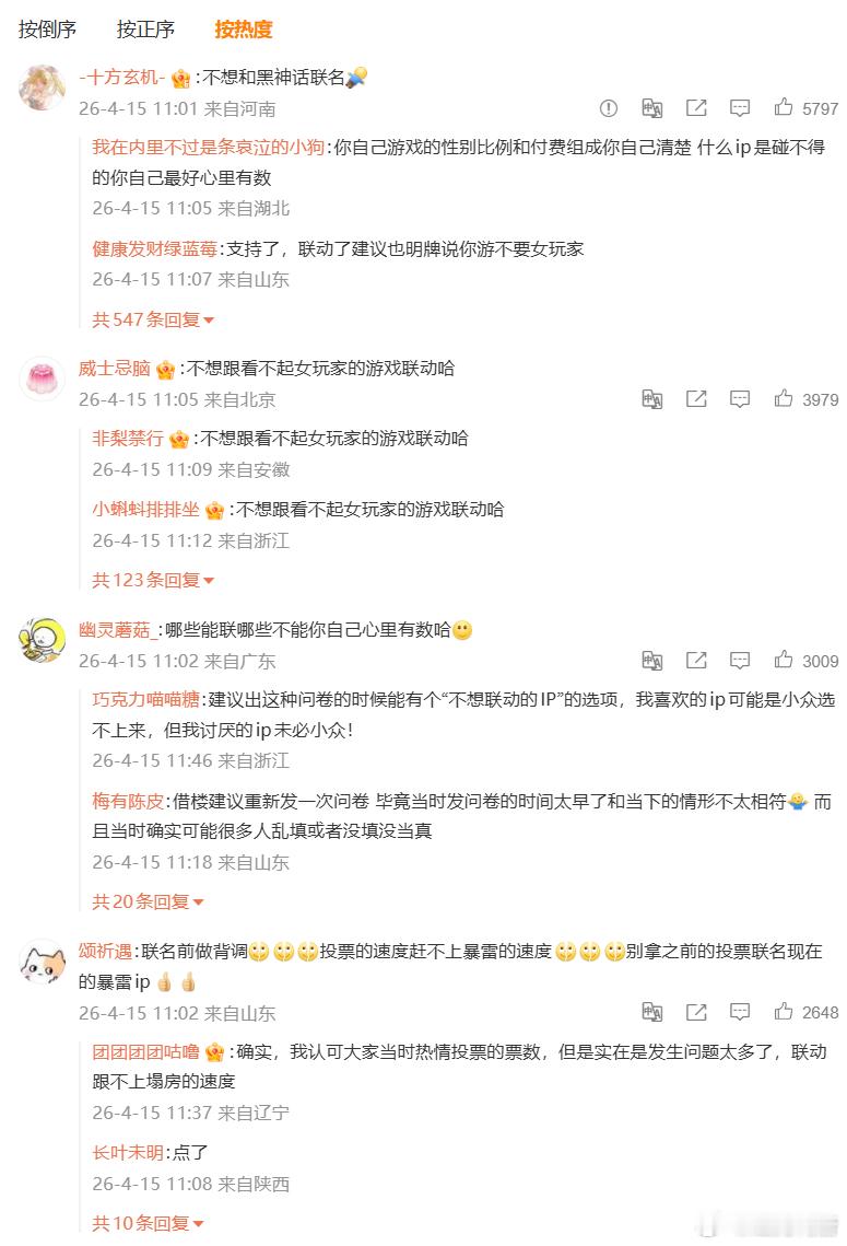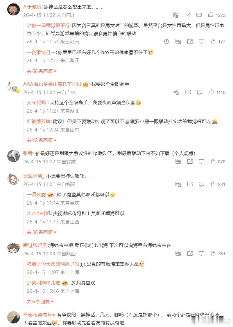 剑网3搞了个联名调查,里面投票高位的有黑神话悟空和哪吒等IP,然后评论区如各位所见。我先不说这投票是剑网3玩家自己投出来的,你想联名人家愿意跟你联么