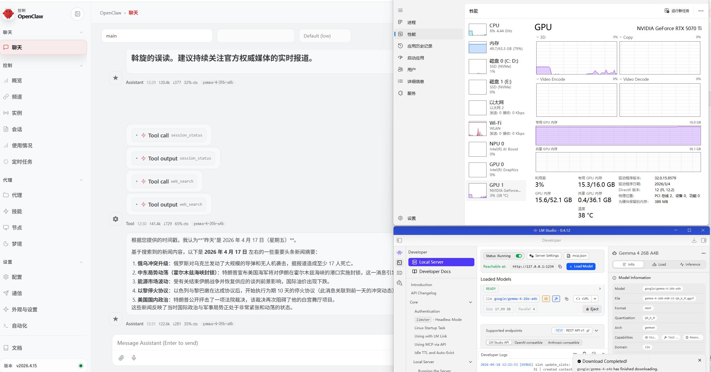 部署完本地量化gemma4 openclaw调用本地算力token,实现了联网搜索,打通了微信的clawbot,正好把所有硬件资源拉满,且卡在没有暴显存的边缘,刚刚好。这就是我为什么要升级这次硬件的原因,AI agent的全面本地化,实现了个人智能体token自由。难怪有人花钥请人配置,这一套组合拳下来,一般人真搞不定。