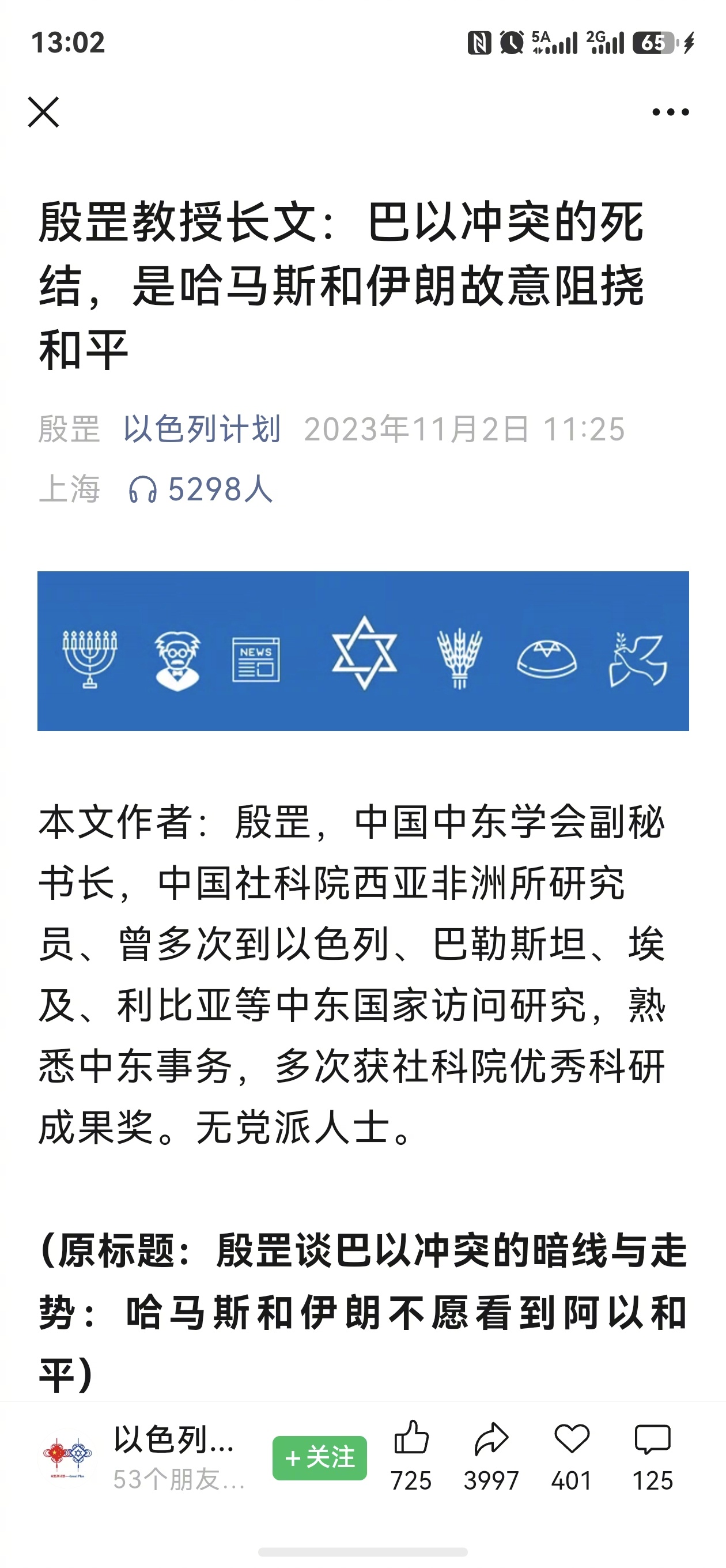 中国中东学会副秘书长、中国社科院西亚非洲所研究员殷罡在《以色列计划》上发文说:巴以冲突的死结,是哈马斯和伊朗故意阻挠和平。