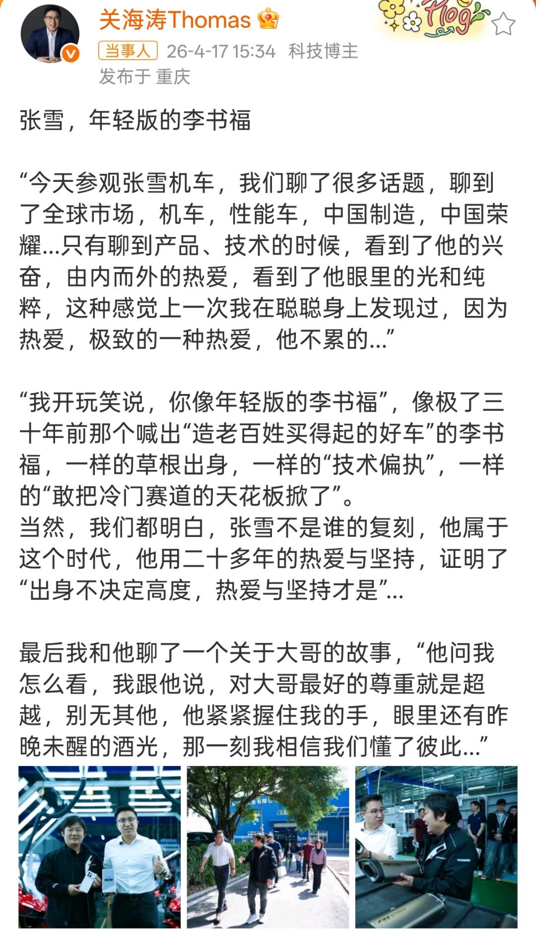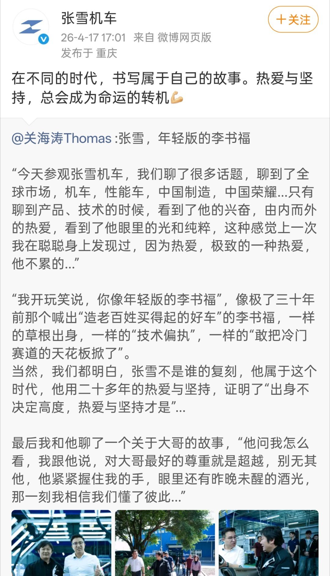 荣耀高管称张雪是年轻版的李书福“在不同的时代,书写属于自己的故事。热爱与坚持,总会成为命运的转机”荣耀给张总送上了全家桶。双方官宣联手之后,期待更多的动作。港真,荣耀也在很努力去做产品,去开拓海外市场。张雪机车一直在坚持自己的热爱,去打造更极致的产品。期待更多的中国品牌,一起联手,向世界展示更多的中国力量