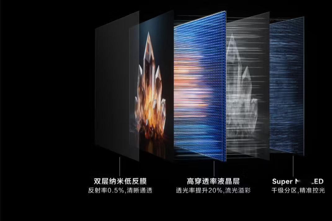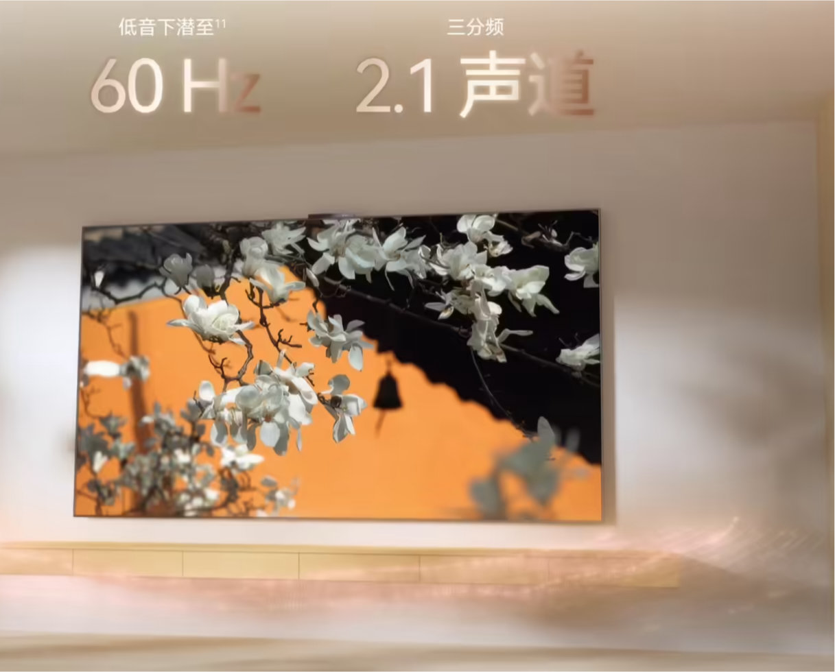 华为智慧屏 S7 Pro 搭载 Super Mini LED 黑晶屏,支持 10.7 亿色、2000nit 峰值亮度,分辨率 4K(3840×2160),拥有 99.0% 屏占比 + 178°(典型值)可视角度,可实现 288Hz 倍频刷新率、超薄零贴墙效果。