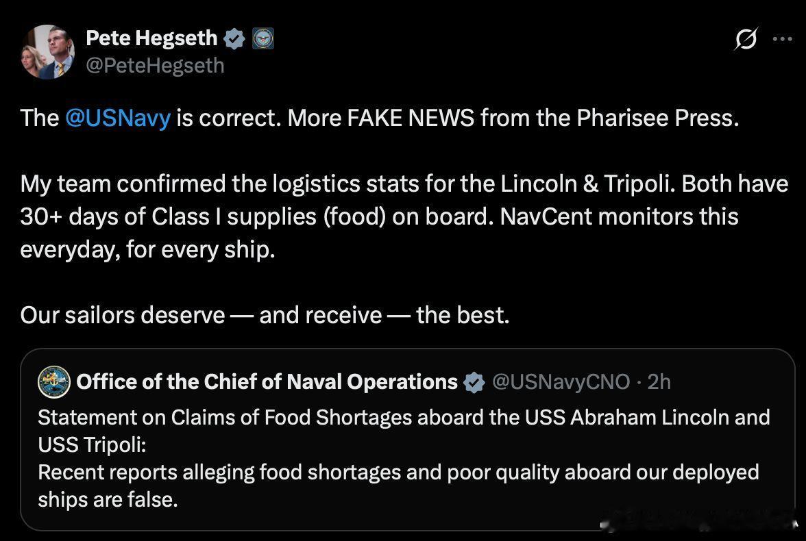 皮特·赫格赛斯@ PeteHegseth美国海军是正确的。又是来自“伪新闻媒体”(Pharisee Press)的假新闻。