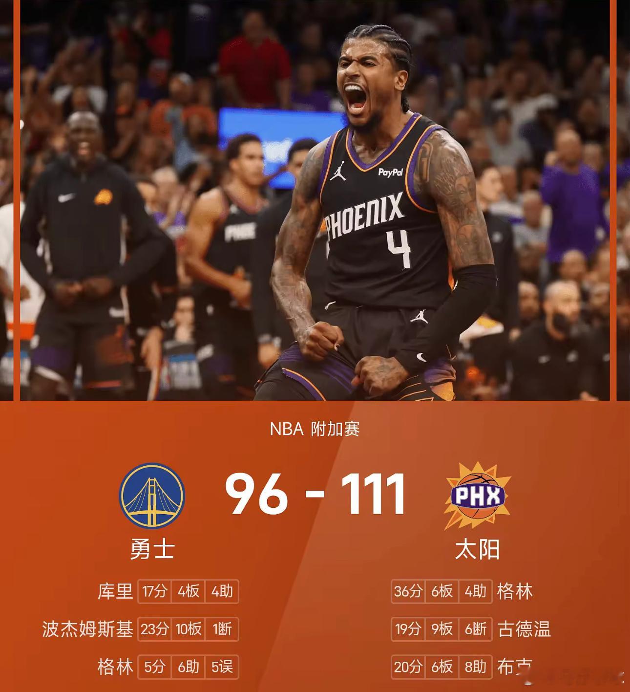 最终,太阳111-96力克勇士,以西部第八身份锁定季后赛最后一席,与雷霆会师季后赛首轮。勇士勇士vs太阳nbanba附加赛