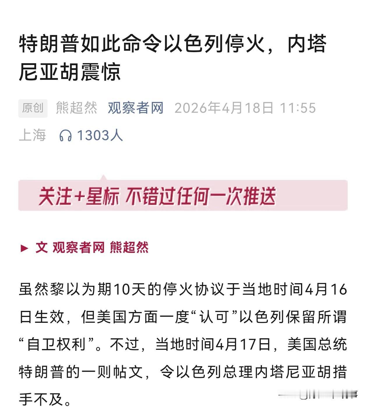 特朗普命令以色列停火!内塔尼亚胡震惊 很多朋友晓得,黎以之间的冲突,从来都不是简单的两国恩怨,背后一直都有美国在暗中操盘、左右走向。 本来眼看局势就要降温,停火协议刚刚生效,谁都以为紧张局面能暂时缓和下来。 结果万万没想到,短短一天时间,剧情大反转,特朗普突然出手,直接当众叫停以色列,把内塔尼亚胡打了一个猝不及防。 事情是这样的: 当地时间4月16日,黎巴嫩为期十天的停火协议正式生效。在这之前,美方一直偏向以色列,还变相承认以色列拥有所谓自卫权限,等于默许它继续动武。 可才刚过去一天,也就是4月17日,特朗普一条社交帖子,直接改写了整个局势走向。 他公开对外表示,接下来美国要直接和黎巴嫩对接合作,由美方亲自出面处理真主党相关问题。 并且态度非常强硬,明确喊话以色列:不许再轰炸黎巴嫩,美国已经明令禁止,现在必须马上收手,到此为止! 后来川普接受美国媒体采访的时候,特朗普再次重申立场。他态度坚决地强调,以色列必须立刻停手,不能再肆意损毁当地建筑,这种行为他绝不允许继续下去。 美国权威媒体都感慨,特朗普这番表态,根本不是商量,而是赤裸裸下命令,逼着以色列必须听话服从。这种强势姿态,放在以往任何一届美国政府身上,都是极其罕见、完全不敢想象的。 最尴尬、最被动的就是内塔尼亚胡和他的智囊团队,看完特朗普的发文之后,全员傻眼、无比震惊。 因为这番表态,跟前一天美国国务院刚敲定的停火内容,完全背道而驰,等于美方一夜之间彻底改口、立场大变。