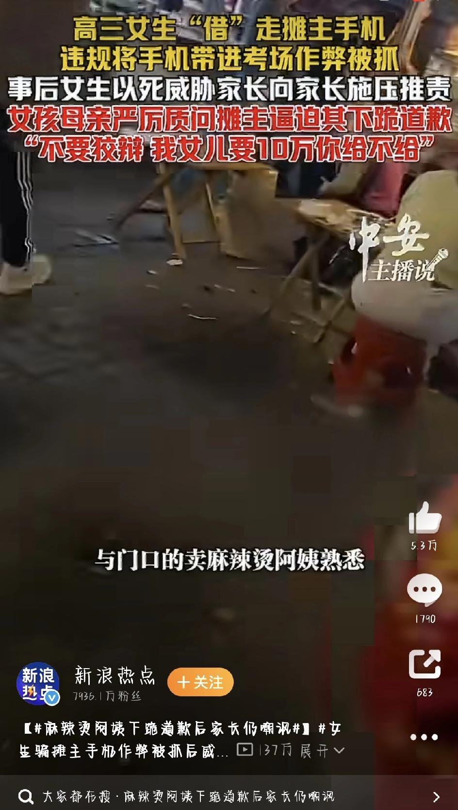 最近,全网都被一件事气得不行——麻辣烫阿姨下跪道歉后家长仍嘲讽冲上热搜,看完整个过程,真是让人又憋屈又心寒。一场考场作弊的风波,最后却让一个无辜的摆摊阿姨背锅、被逼下跪,哪怕阿姨已经认错道歉,家长还在那冷嘲热讽。这种三观炸裂的操作,引来了网友一边倒的批评。 事情发生在重庆。当事女孩是个高三学生,平时经常光顾路边一个麻辣烫小摊,跟摆摊阿姨挺熟的。考试那天,女孩撒谎说自己急着打电话,阿姨心善,没多想就把手机借给了她。 谁能想到,女孩根本不是要打电话,而是偷偷把手机带进考场作弊。结果作弊被当场发现,事情彻底闹大了。被抓之后,女孩不但没有反思自己的错,反而情绪崩溃,拿自杀来威胁父母,把责任全甩锅给了好心借手机的阿姨。 在女儿的逼迫下,女孩妈妈不分青红皂白,直接冲到麻辣烫摊上找阿姨兴师问罪。全程语气强硬,态度蛮横,一个劲儿地指责阿姨,还不断施加压力,逼阿姨认错。 这位阿姨就是个老实本分的小摊贩,平时起早贪黑挣点辛苦钱,纯粹是出于好心帮忙,结果惹上这么大的麻烦。面对对方的强势逼人,阿姨实在没办法,只能低头妥协,当场跪了下来,一遍遍说着“我错了”,那个姿态又卑微又让人心疼。 本以为阿姨都下跪认错了,事情总该收场了吧?可更让人寒心的是,女孩家长一点都没心软,反而继续冷嘲热讽,丢下一句:“这一跪我可受不起。”全程没有半点同情,得理不饶人,步步紧逼,场面看得人格外难受。更过分的是,家长还言语威胁,说什么要是女儿要十万赔偿,你给不给?句句都在刁难这个老实人。 捋一捋整件事,错的从头到尾都是那个高三女孩。明知道考试不能带手机,故意骗了好心阿姨,蓄意作弊。闯了祸之后不敢承担后果,不敢面对自己的问题,只会拿极端方式逼家里人,反过来冤枉一个无辜的陌生人。 阿姨不过是因为平时跟女孩熟,出于信任借了手机,既没有害人的心思,也不知道女孩要拿去作弊,纯粹是飞来横祸。辛辛苦苦摆摊过日子,平白无故被骂、被羞辱,实在太委屈了。 网友们看完这事也都炸了,纷纷吐槽这家长不讲道理、是非不分。孩子犯错不教育、不纠正,反倒揪着无辜路人往死里逼,纵容孩子逃避责任,这种教育方式才是最可怕的。 犯错就要认,责任得分清。作弊是女孩自己的选择,拿自杀威胁家人是她的问题,不能因为孩子高考受挫,就随便欺负底层老实人。善良不该被这样消耗,老实人也不该白白受辱。希望这件事能有个公正的说法,别让好心帮忙的人,最后寒了心。 来源:新浪热点