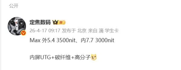 博主“定焦数码”在其社交平台进一步披露了华为Pura X Max的核心屏幕参数。据最新爆料,该机预计将配备一块亮度高达3500尼特的5.4英寸外屏和一块7.7英寸3000尼特的内屏。其中,内屏可能采用UTG(超薄柔性玻璃)+碳纤维+高分子复合材料的三重防护结构,有望大幅提升屏幕的平整度、抗冲击性与耐用性。