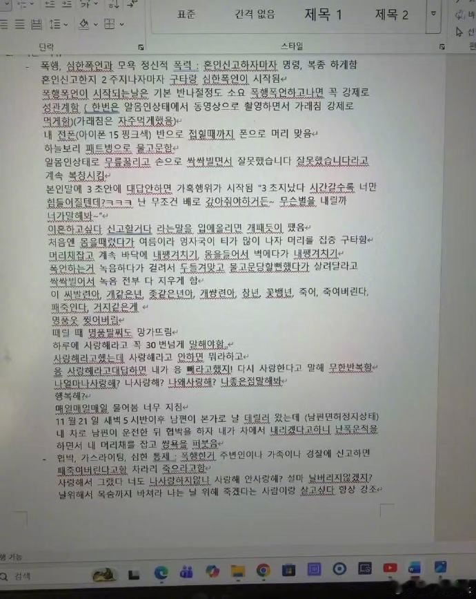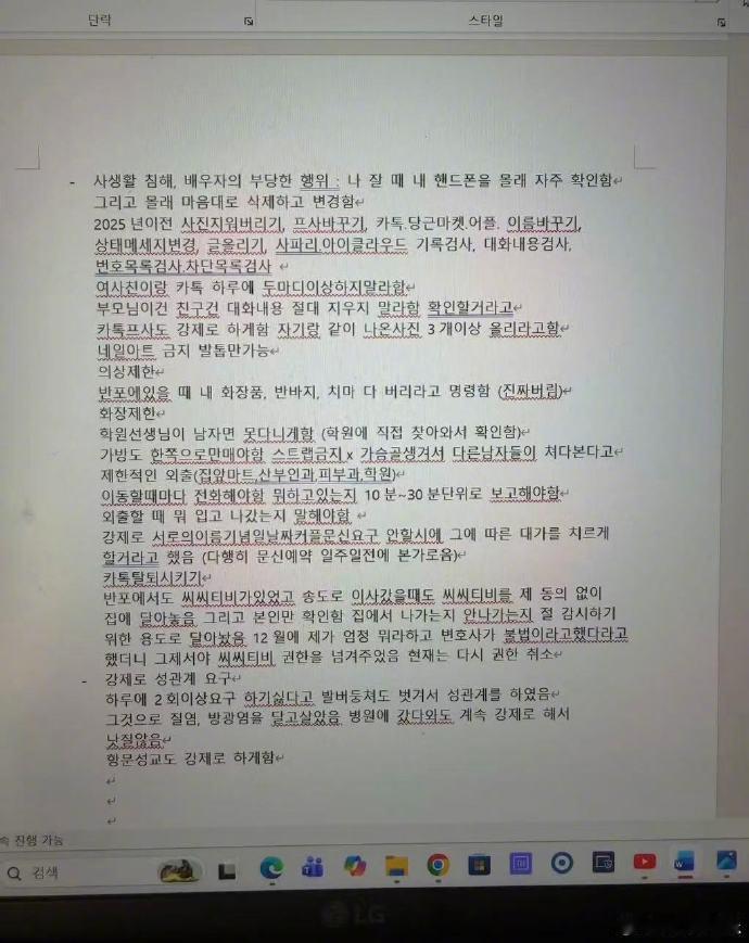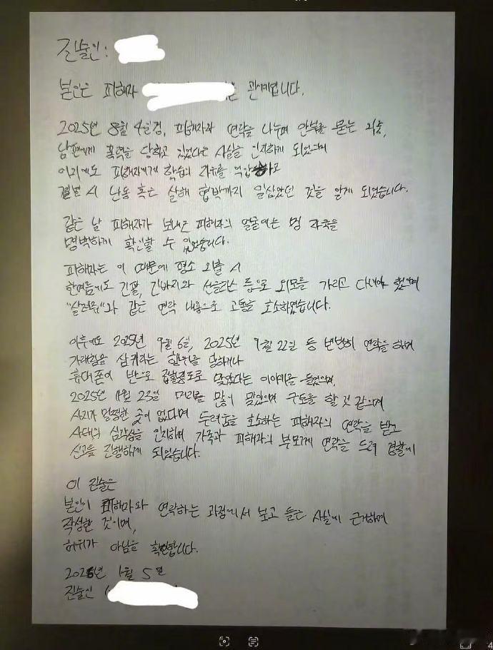 【jisoo哥哥被曝家暴】疑似jisoo嫂子晒家暴伤痕18日,韩网爆料疑似金智秀哥哥家暴,其中包括陈述书和身体受伤的照片。陈述书中提到操控、殴打、限制着装等等。“提离婚、举报就会像打狗一样挨打”、“暴行之后总是会被强制发生性关系,在裸体状态下被拍视频、还曾被强迫吃痰。”据悉,昨天有报道称一金姓男子试图对主播性侵被警方抓捕,疑似是金智秀的哥哥。但目前金智秀哥哥方并没有回应。去年5月他也曾卷入“非法偷拍”争议。(新浪娱乐)jisoo的哥哥已婚