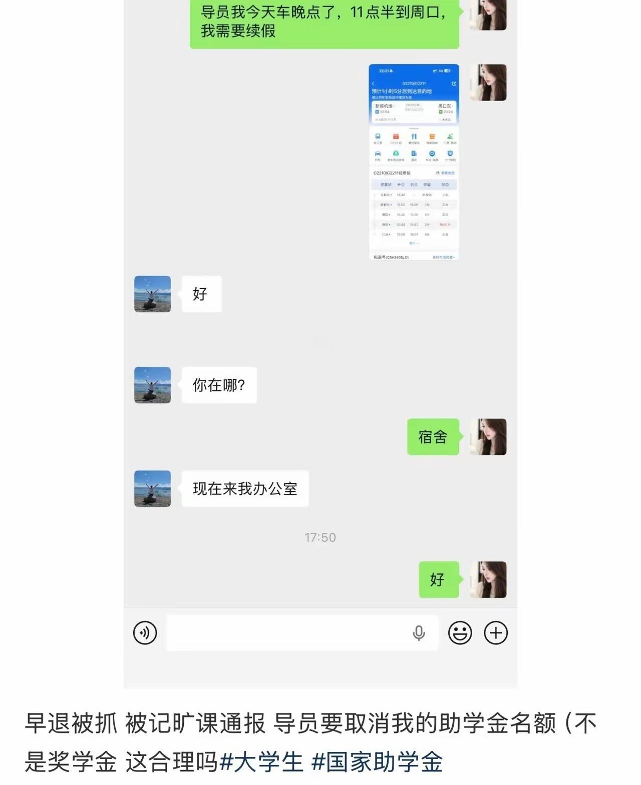 这下真闹大了, 就因为早退一次被记旷课, 辅导员直接取消了女大学生的助学金,换谁都难以接受。 早退违纪按规定处理无可厚非,该通报通报,该扣分扣分,但直接把助学金一刀切取消,实在有点太重了。 助学金本来是用来帮助家庭困难学生完成学业的,和纪律处分不能简单画等号。 很多时候学校管理容易走极端,一犯错就全盘否定,用最狠的方式处理问题,看似立规矩,实则寒了学生的心。 教育不该是一棍子打死,违纪有违纪的处罚,助学有助学的初衷,两者混在一起,既不公平也不合理。 规矩是死的人是活的,真正的管理,是讲道理、讲分寸,而不是随意动用权力一刀切。 你觉得,一次早退就取消助学金,合理吗?学生处分争议 校园处分 高校处分 早退开除 学生被辞退 大学开除 校园不当惩罚