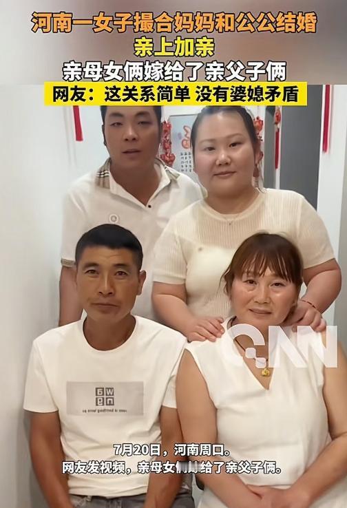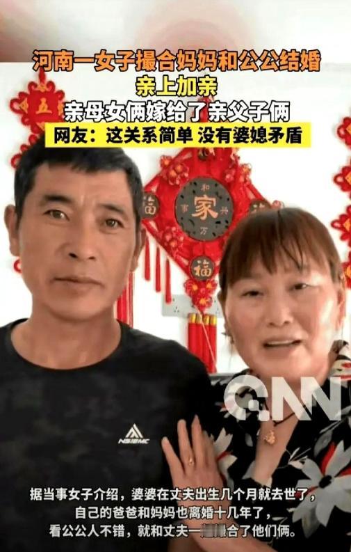 “彻底乱套了!”河南周口一女子结婚后,看公公天天闷在家里孤单寂寞,一咬牙,竟然将自己的亲妈许配给了公公。亲母女俩,直接嫁给了亲父子俩,四个人硬是拼成了一个新家庭! 故事的主角是周口农村的莎莎,她嫁进马家后,家里就有了两个孤单的老人。公公马先生在儿子五个月大时失去妻子,一个人又当爹又当妈,省吃俭用二十多年,把儿子拉扯成人,盖了新房,办了婚礼。 等儿子成家后,家里的热闹劲儿散了,马先生除了帮着带孙子,其余时间都是一个人过,吃饭随便对付,身形也慢慢消瘦下来。 莎莎的母亲智女士,在女儿一岁多的时候就和前夫离婚,独自打零工把莎莎养大,二十多年来逢年过节都是一个人,年夜饭从来没有家人陪伴,常常对着窗户发呆。 莎莎看在眼里记在心里,嫁过来一段时间后,她突然有了个想法:把自己的母亲介绍给公公。这个想法一说给丈夫,丈夫立马点头同意,他早就心疼父亲孤单,只是怕亲戚邻居说闲话,没敢主动提。可两位老人一听这事,当场就反对了。马先生觉得和亲家母处对象太“丢人”,怕村里人戳脊梁骨;智女士也觉得别扭,第一次听说时还把女儿说了一顿。 小两口没放弃,想着得让两位老人多接触接触。从那以后,莎莎经常让母亲来家里帮忙带孩子,丈夫也常叫父亲过来一起吃饭。两人一起陪着孩子在院子里玩,一起去菜市场买菜,回家后一个择菜一个做饭,慢慢有了不少共同话题。莎莎总跟母亲说,公公是个老实人,勤快顾家,对自己也像亲女儿一样;丈夫也跟父亲念叨,智女士善良能干,两个人搭伴过日子能互相照应。一来二去,两位老人心里的顾虑渐渐少了。 2020年腊月,两人一起去了民政大厅,工作人员核实清楚双方都是单身,没有血缘关系,而且是自愿结合,依法给他们办了结婚登记手续。消息传到村里,当晚村民的微信群就“炸锅”了。村里的老人们纷纷反对,说这辈分都乱了,以后亲戚之间没法称呼,违背了祖宗定下的规矩;而年轻人大多表示支持,觉得只要老人过得幸福,辈分就是虚的,没必要太较真。 面对亲戚串门时的称呼尴尬,莎莎干脆直接说明:“该怎么叫就怎么叫,不用纠结。”她依然叫母亲“妈”,叫公公“爸”,让亲友们跟着自家的称呼来,不用讲究那些虚礼。慢慢的,大家也就习惯了这种特殊的家庭关系。 如今,智女士和马先生已经结婚快五年了,这五年里,两人从来没有吵过一次架。马先生把自己的工资全部交给智女士保管,家里的重活累活都主动承担,闲下来就帮着带孙子;智女士把家里收拾得干干净净,每天变着花样做饭菜,让家里的烟火气越来越浓。 智女士不再像以前那样独居时舍不得开灯,现在家里热热闹闹,她心里踏实得很;马先生也不再孤单,每天有伴说话,吃饭有人照料。更让人省心的是,因为莎莎的婆婆就是自己的亲母亲,这家人从来没有过婆媳矛盾,母女俩相处得比以前更亲近。两位老人还在婚前就约定好,家里所有的财产以后都归莎莎和丈夫所有,这也让小两口没有了后顾之忧。 现在的这个四口之家,每天的生活过得井井有条。早上一起起床,老人帮忙准备早饭,小两口收拾好去上班;晚上下班回家,一家人围坐在一起吃饭,聊聊一天的事儿,饭后轮流带孩子、做家务。遇到农忙或者家里有事儿,四个人分工合作,互相体谅,日子过得比村里不少普通家庭都要和睦。 曾经引发全村争议的“特殊组合”,用五年的时间证明了,家庭的幸福不在于是否符合传统规矩,而在于成员之间的互相陪伴和体谅。没有复杂的矛盾,没有多余的猜忌,每个人都在自己的位置上付出,这或许就是最简单也最实在的幸福。