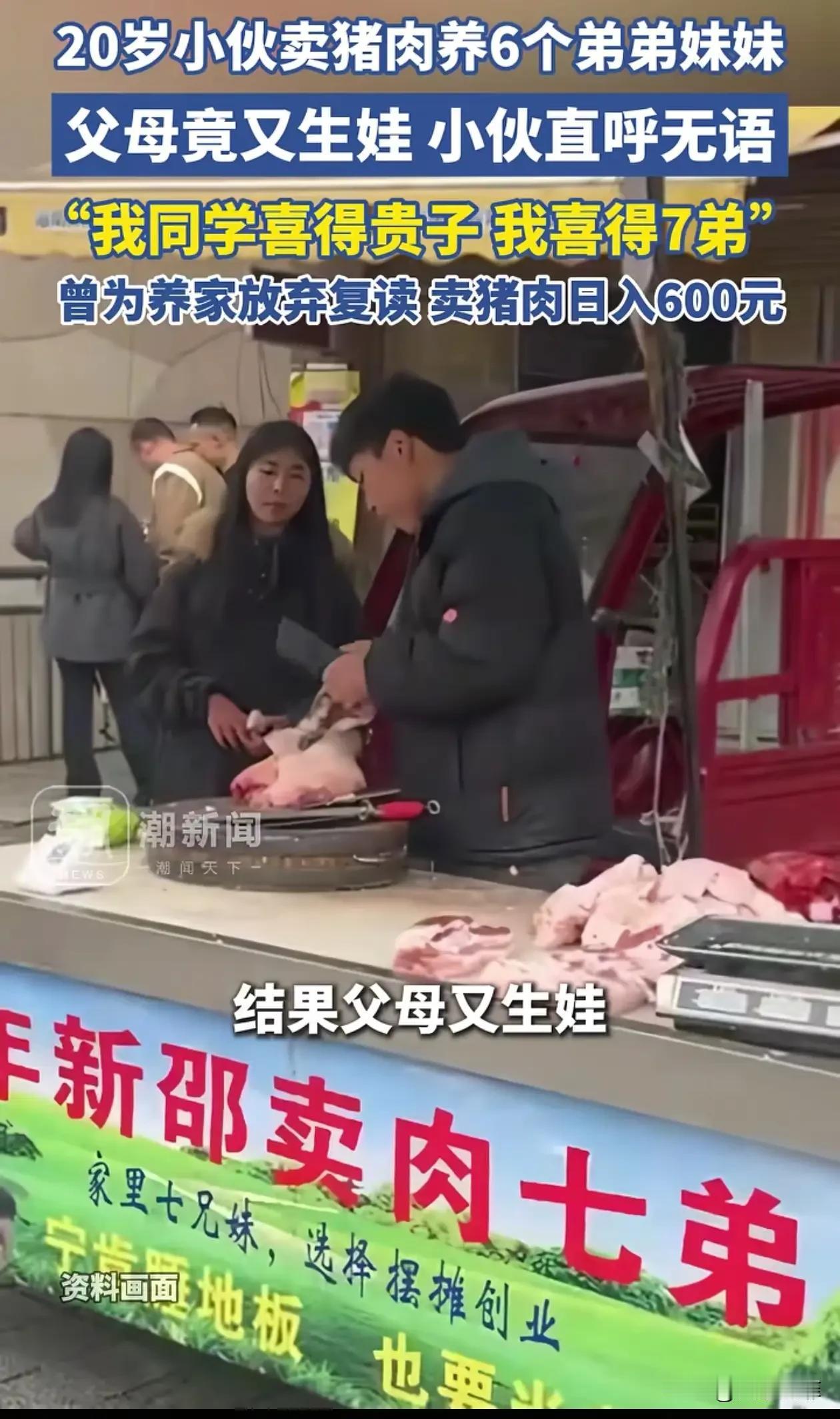 湖南邵阳,20岁小伙为养6弟妹放弃复读,卖猪肉日入600元,谁料父母竟又生出了七弟!小伙苦笑:同学当爹我当哥! 孙攀是家里的老大,他的爸妈生了6个弟弟妹妹,加上他一共7个孩子。爸妈身体不好,靠打零工,种田生活,根本养不起这么多人。 两年前,孙攀高考没考好,本来想复读考大学,想靠读书改变命运。但看着一大家子人要吃饭,弟弟妹妹要上学,爸妈愁得头发都白了,他只能放弃复读。他说:“我是老大,我不扛,谁扛?” 于是他开始学卖猪肉,每天凌晨两三点就起床,先去进货,然后去市场摆摊,一直忙到晚上七八点,一天干16小时,满身油污,手上全是老茧。 他一天能赚近600块,几乎全部拿回家,负担全家吃穿用度,自己省吃俭用,几乎不花钱。 他20岁,本该是谈对象,规划自己未来的年纪。同学群里,有人晒喜得贵子,当爸爸了。结果他爸爸告诉他:“你妈又怀孕了。”孙攀当场崩溃,他忍不住自嘲:“同学喜得贵子,我喜得七弟。” 现在妈妈已经生下第七个孩子,孙攀还是每天卖猪肉,继续养7个弟弟妹妹。他把家里情况写在牌子上放摊位前,很多人特意来买他的肉。他表示,只能继续撑着,希望弟弟妹妹快点长大。 孙攀的父母在经济能力、精力都严重不足的情况下,连续生育多个孩子,本身就是不理性,不负责任的选择。 生而不养,养而不教,把养家重担转移给刚成年的长子,本质上是把孩子当劳动力,而不是用心抚养。这不是“家庭温暖”,是明显的责任错位。 孙攀选择扛起家庭,是他的孝心和担当,应该尊重。但也希望他明白:孝顺不等于无限度牺牲自己。他可以帮家里,但也要留一点空间给自己,为自己而活。 不是“孩子多就一定不幸福”,而是能力配不上欲望。真正的负责,是有多大能力养多少孩子,而不是生下来让大的带小的,让老大牺牲一生。 父母有生育的自由,但必须承担养育的责任。哥哥懂事孝顺值得尊敬,但他的人生不该被家庭彻底捆绑。真正的家庭幸福,从来不是靠孩子多,而是靠每个人各负其责,彼此体谅。