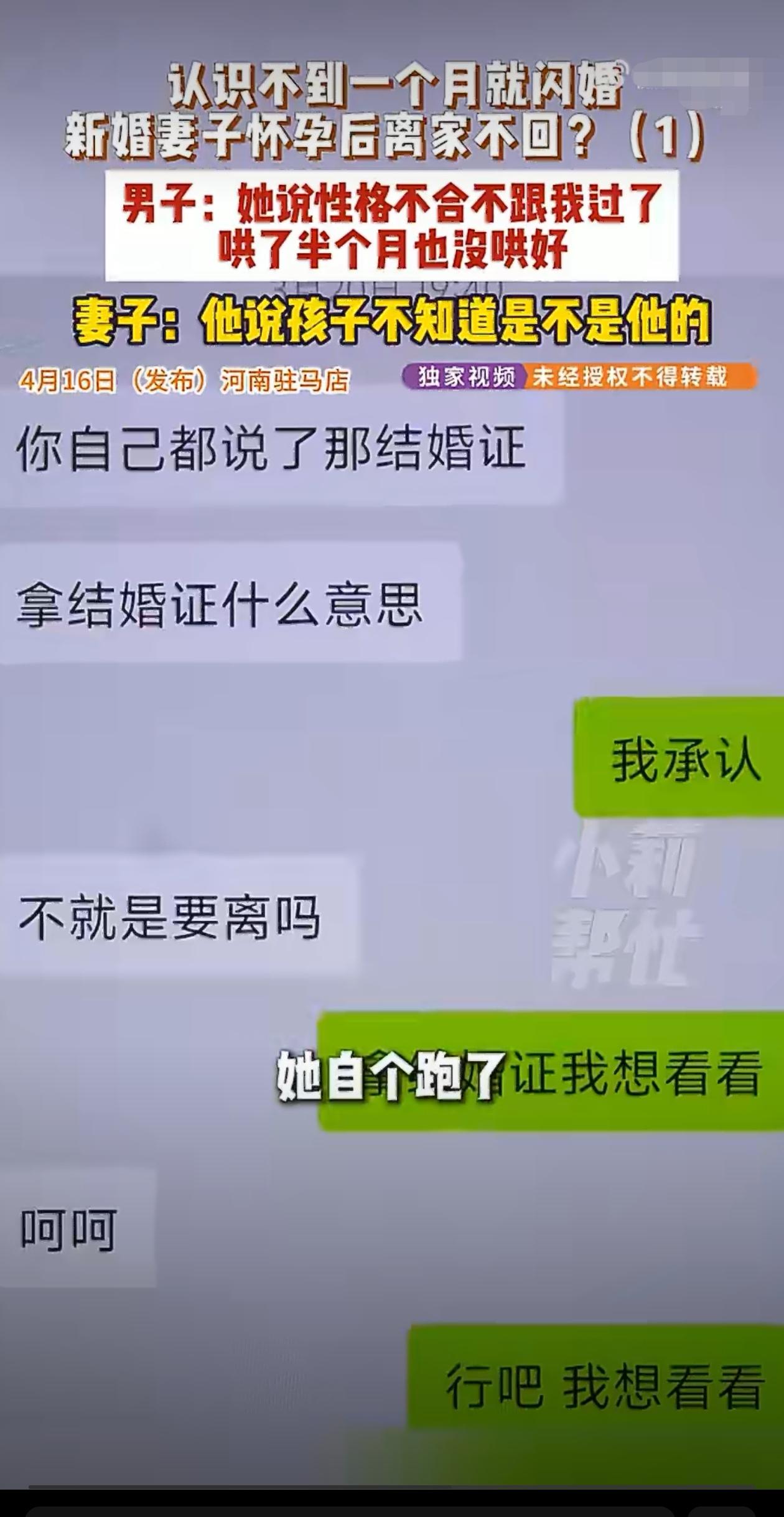 这是什么操作?河南驻马店一对00后男女相亲认识不到半月闪婚,男方家花费近40万。婚后共同生活仅约7天,因琐事(如被子潮湿引发争执)产生矛盾,女方态度冷淡并独自回娘家提出离婚,称"生理性厌恶"。随后女方告知怀孕,但男方对胎儿亲子关系表示怀疑,双方信任破裂。