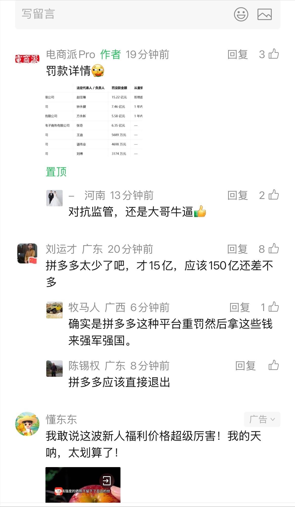 拼多多的胆子真大,网友第一反应是“罚得太少了”。 7家电商平台,拼多多被罚15亿+,以其赚钱能力而言,确实不高。仔细看媒体的置顶评论,该平台“拒绝提供材料,对抗监管”,真是看不清形势! 一直以来,这个平台颇受诟病,屡屡被投诉却丝毫不受影响,也是根基深厚。 该平台的存在和扩张,证明经济更好吗? 熟悉电商行业的人都清楚,拼多多早已不是当年那个靠着低价突围的小众平台,如今的它,市值稳居行业前列,日活用户突破数亿,营收规模逐年暴涨。 有数据显示,拼多多单季度的净利润就远超百亿,15亿的罚款,不过是其短短几天的营收,这样的处罚力度,对于根基深厚的拼多多而言,更像是一次“象征性警告”,而非真正意义上的惩戒。 更让网友愤怒的,并非罚款金额本身,而是拼多多在监管过程中的嚣张态度,在监管部门依法开展调查、要求其提供相关经营材料时,拼多多非但不配合,反而刻意规避、拒不执行,这种无视监管、挑战规则的做法,彻底触碰了公众的底线。 有人不禁反问:到底是谁给了拼多多这么大的胆子?敢于公然对抗监管,敢于在违规的边缘反复试探,即便屡屡被投诉、被处罚,依旧我行我素、毫不受影响。 事实上,长期以来,拼多多就一直饱受诟病,虚假宣传、假货泛滥、虚假发货、售后缺失等问题,早已成为网友投诉的重灾区。 打开各类投诉平台,关于拼多多的投诉比比皆是。 有消费者花正品的钱,收到的却是粗制滥造的仿冒品,有商家入驻后,被平台随意克扣保证金、强制要求低价促销,稍有反抗就被限流、下架,还有用户遭遇虚假活动,明明达到活动要求,却被平台以各种理由拒绝兑现福利。 可即便投诉量常年居高不下,即便多次被监管部门约谈、处罚,拼多多的扩张步伐从未放缓,甚至愈发迅猛。 难道真的是因为拼多多根基深厚,就可以无视规则、肆意妄为吗?难道监管的力度,真的不足以约束这样一家巨头企业吗? 网友的愤怒,从来都不是无理取闹,而是源于长期以来的失望与无奈,那些被坑害的消费者,那些被压榨的小商家,他们的权益一次次被忽视,而违规的企业,却总能全身而退,甚至继续赚得盆满钵满。 当一个平台靠着低价内卷、虚假宣传、规避监管来抢占市场,当它的盈利建立在损害消费者和小商家权益的基础上,这样的扩张,到底是推动经济发展,还是在扰乱市场秩序、破坏行业生态。 我们不得不承认,拼多多的崛起,确实改变了很多人的消费习惯,也为部分中小企业提供了生存空间,但这绝不意味着,它可以凭借自身的规模和影响力,凌驾于规则之上,无视监管的存在,忽视公众的诉求。 监管的意义,从来都不是“走过场”,而是要真正守住市场的底线,保护每一位消费者和经营者的合法权益。 15亿罚款,或许对于拼多多来说无关痛痒,但我们希望,这能成为一个警示信号,没有任何一家企业,可以凭借自身实力对抗监管,没有任何一种违规行为,可以被轻易纵容。 网友的“罚得太少”,本质上是对公平正义的追求,是对规范市场秩序的期盼。 试想,如果每一家违规企业,都能靠着“罚得太少”而继续我行我素,那么市场秩序将被彻底打乱,消费者的权益将无法得到保障,那些坚守规则、诚信经营的企业,又该如何生存? 如果监管的力度,始终跟不上企业违规的步伐,那么“处罚”二字,终将失去其应有的意义。 拼多多的胆子,从来都不是凭空而来的,它的肆无忌惮,源于对规则的漠视,源于对处罚力度的轻视。 这次15亿罚款,是一次警告,更是一次提醒:无论企业规模多大、根基多深,都必须敬畏规则、配合监管,都必须守住诚信经营的底线。 我们不否定拼多多为电商行业带来的改变,也不否认它在推动低价消费、乡村振兴等方面做出的尝试,但这一切,都必须建立在合规经营、尊重权益的基础之上。 如果拼多多依旧不知悔改,依旧对抗监管、漠视诉求,那么再多的“象征性处罚”,也无法挽回公众的信任,最终只会被市场和消费者所抛弃。 (每期带大家了解一点不一样,点赞关注,主页的内容更加精彩!) 对此大家怎么看?