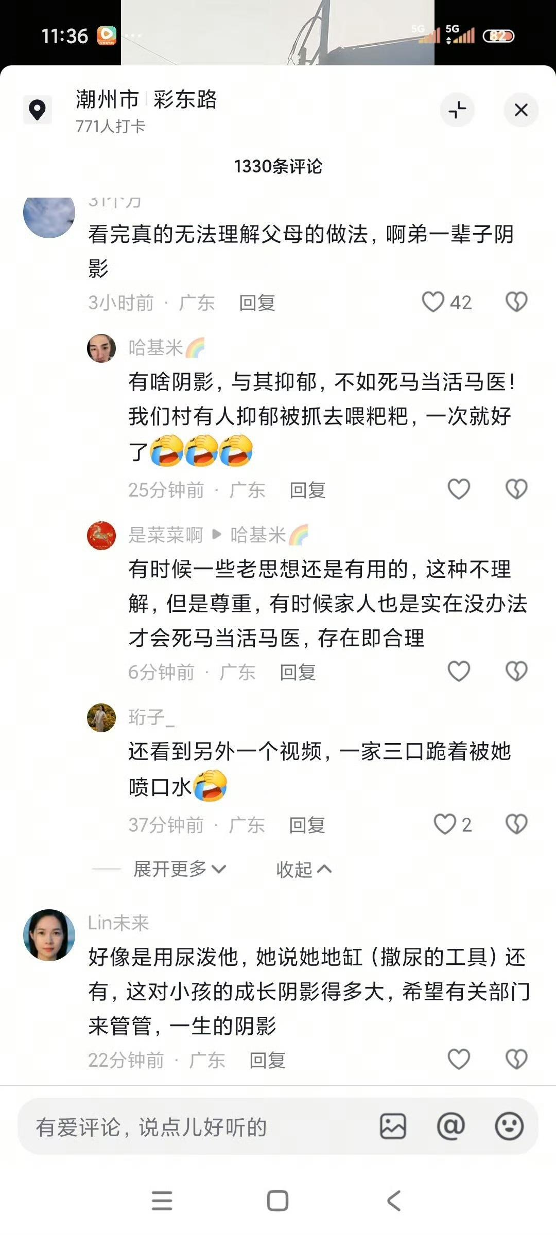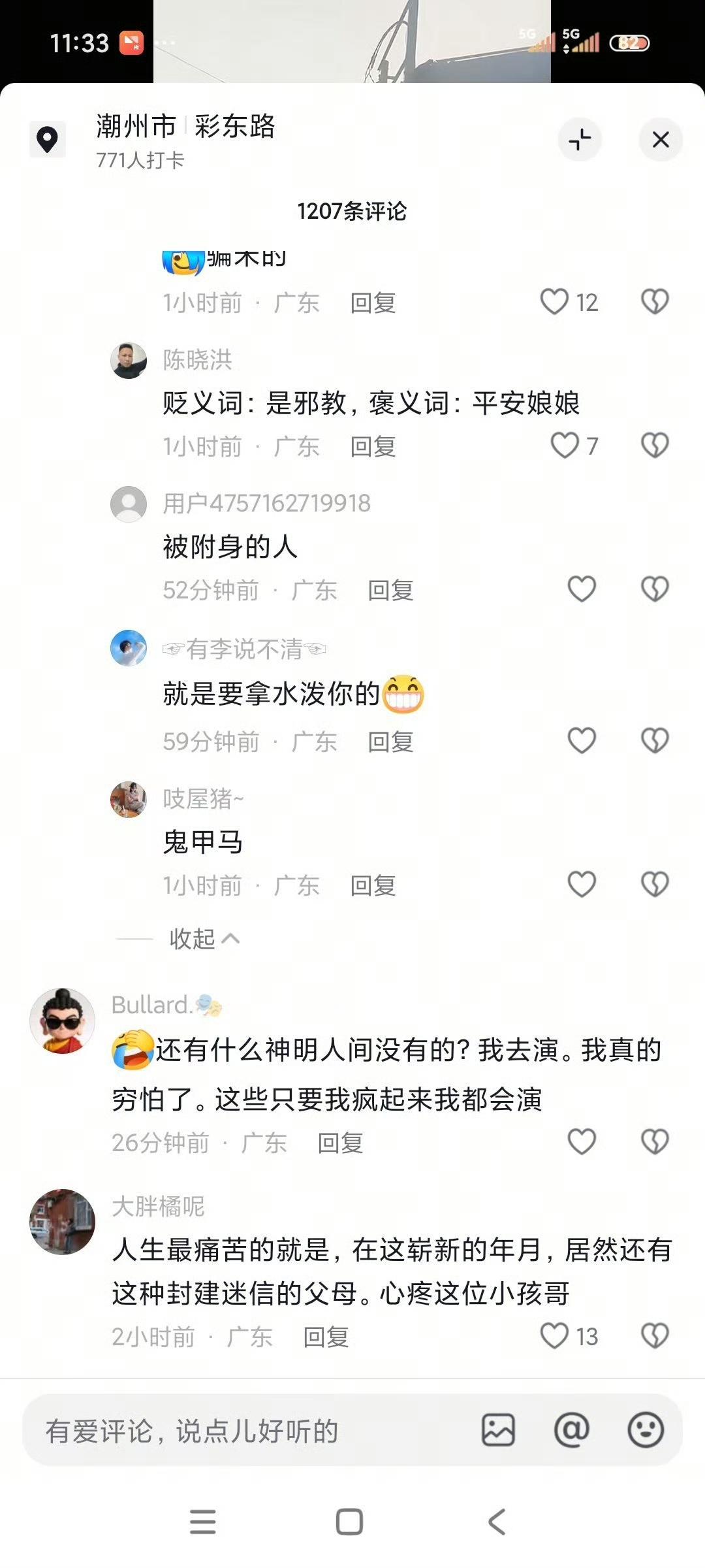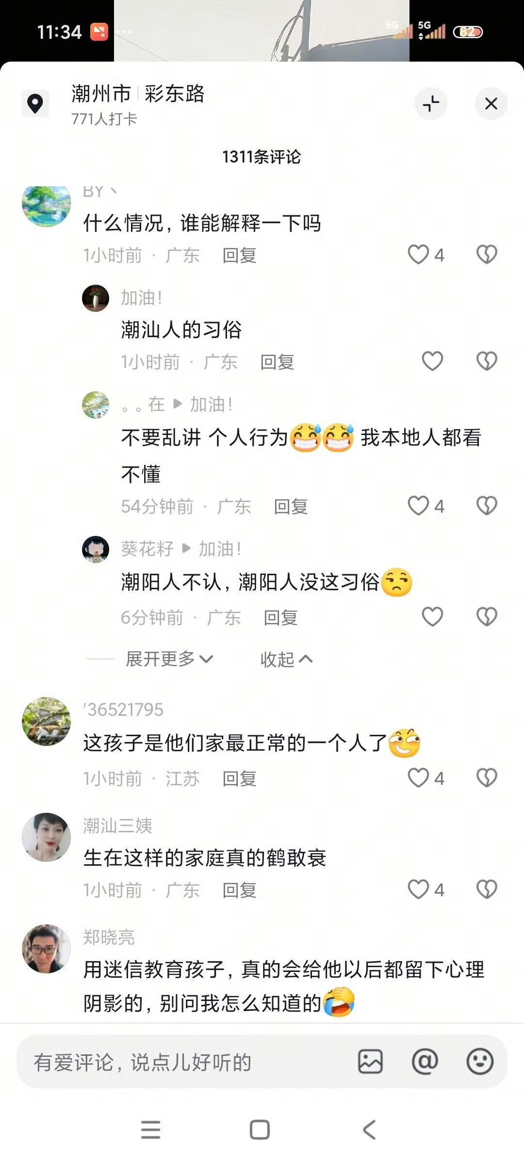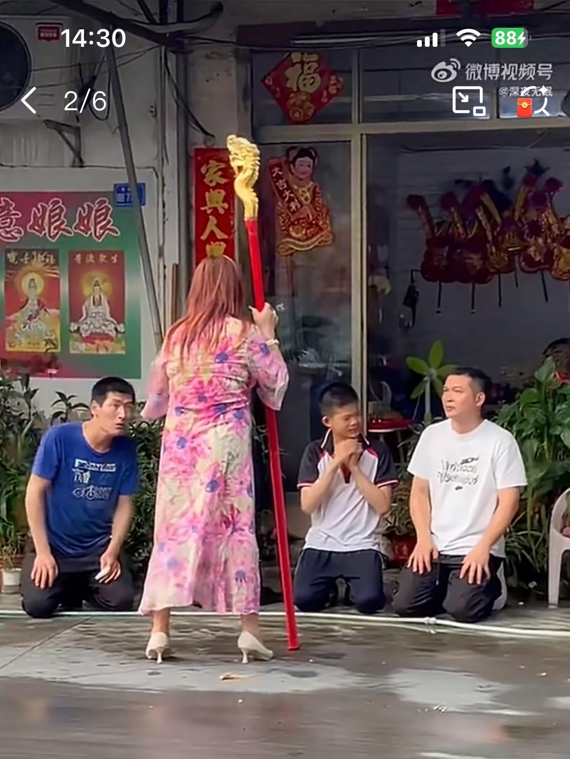 广东潮州一户门口跪着一家人,面前站着一个女人正对着他们做法事。原来这个女人是彩塘平安娘娘的化身,是这家人请来驱邪保平安的。从视频里面看,应该是这家的孩子生病了,或者是心理出了问题。家人可能求医问药没有效果,就把当地民众都信的平安娘娘邀请过来,在家门口做一场法事。女子手持一个神杖,振振有词。过一会,对着小男孩的身上泼洒东西,有网友说这可能是尿。起先小孩有一点抗拒,被爸爸强力压制。后面他也不反抗了,任由那名女子在他身上泼洒。 21 世纪的家长,脑子依然没有进化,还在相信上古时期的那一套封建迷信。如果装神弄鬼真的有用,那孩子怎么可能生病?其实看了家长的这种骚操作,就明白孩子们为什么会得病。根源是在家长,不是孩子。