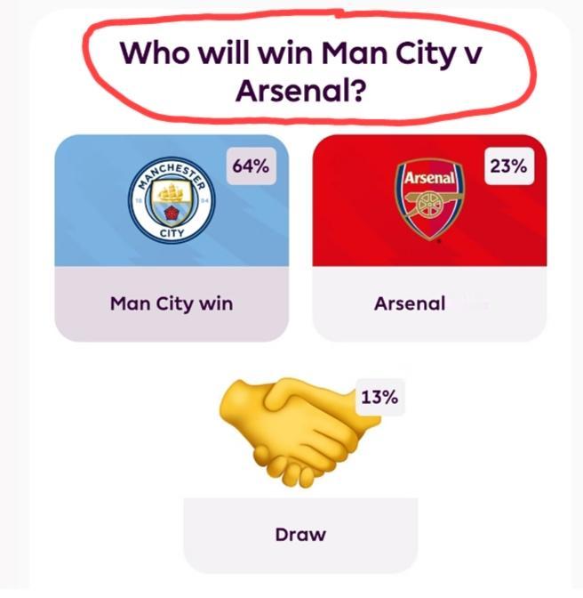 “谁会赢得曼城vs阿森纳的这场比赛”? 64%球迷认为曼城会赢,13%球迷认为双方会打平,只有23%球迷认为阿森纳会赢! 按照两队近一个月的状态,绝大部分球迷给出这样的预测结果也是在情理之中。那23%,估计都是阿森纳的铁杆粉丝吧? 不过,足球毕竟是圆的,比赛没有结束之前,任何结果都有可能发生,我们且看看阿森纳会不会惊掉大家的下巴!!!