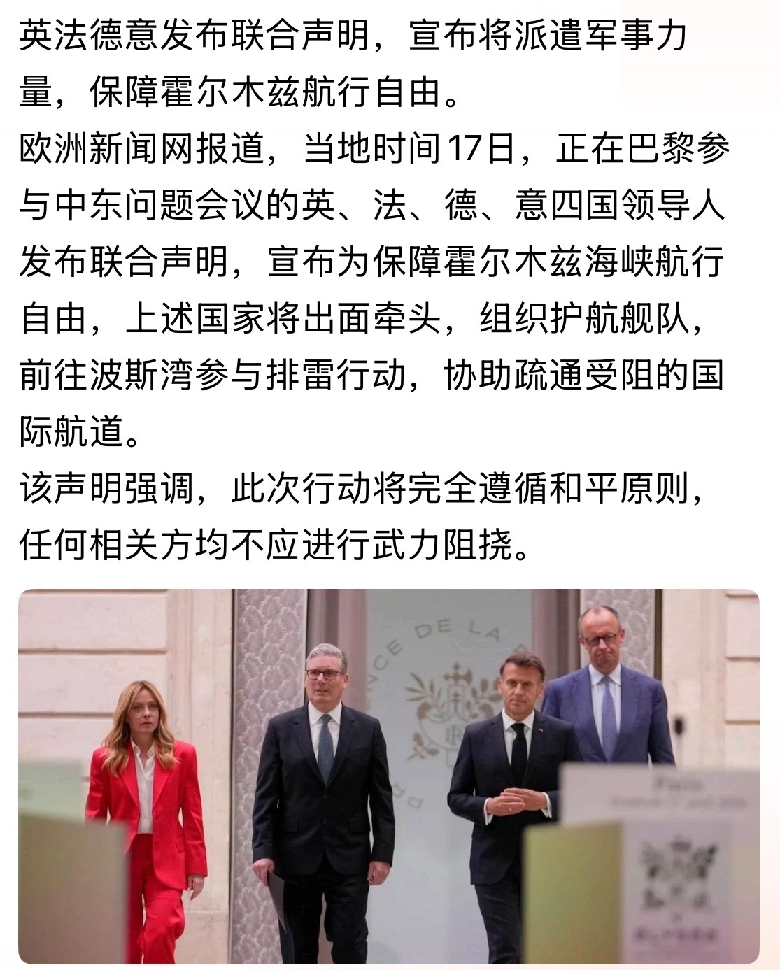 英法德意发布联合声明,宣布将派遣军事力量,保障霍尔木兹航行自由。美以伊冲突