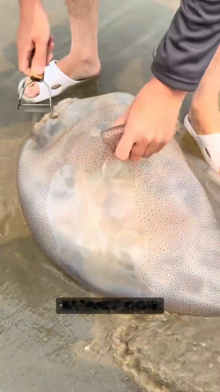 海蜇极速处理。 注意看,这些海蜇刚被冲上岸就得立刻动刀,因为再慢一步就开始化了。海蜇一离开海水不是慢慢死亡,而是直接塌掉,整个身体90%以上都是水表面。这层薄皮一旦不处理,几分钟内就会发软、出水、塌陷。再拖一会不是不好吃,而是直接没了。就算想带回去,路上也会化成一滩。 所以渔民只能当场瓜皮分离,先把还能吃的部分抢出来,把结构锁住,外面那层基本会被处理掉,慢一步整桶白干。更关键的是新鲜海蜇本身带有毒性,如果不急及时处理,不仅不能食用,还存在一定风险。 很多人会问,这样直接削它会不会疼?其实不会。海蜇没有大脑,也没有完整的神经系统,只能做简单反应,并不会产生痛觉。但处理完也不能直接吃,还必须马上用盐和明矾腌制,把水分脱掉,把形态固定,同时去除残留毒性。少一步要么软塌,要么发腥,要么不安全。最后吃到的那种脆爽口感不是新鲜,而是一步步被控制出来的结果。