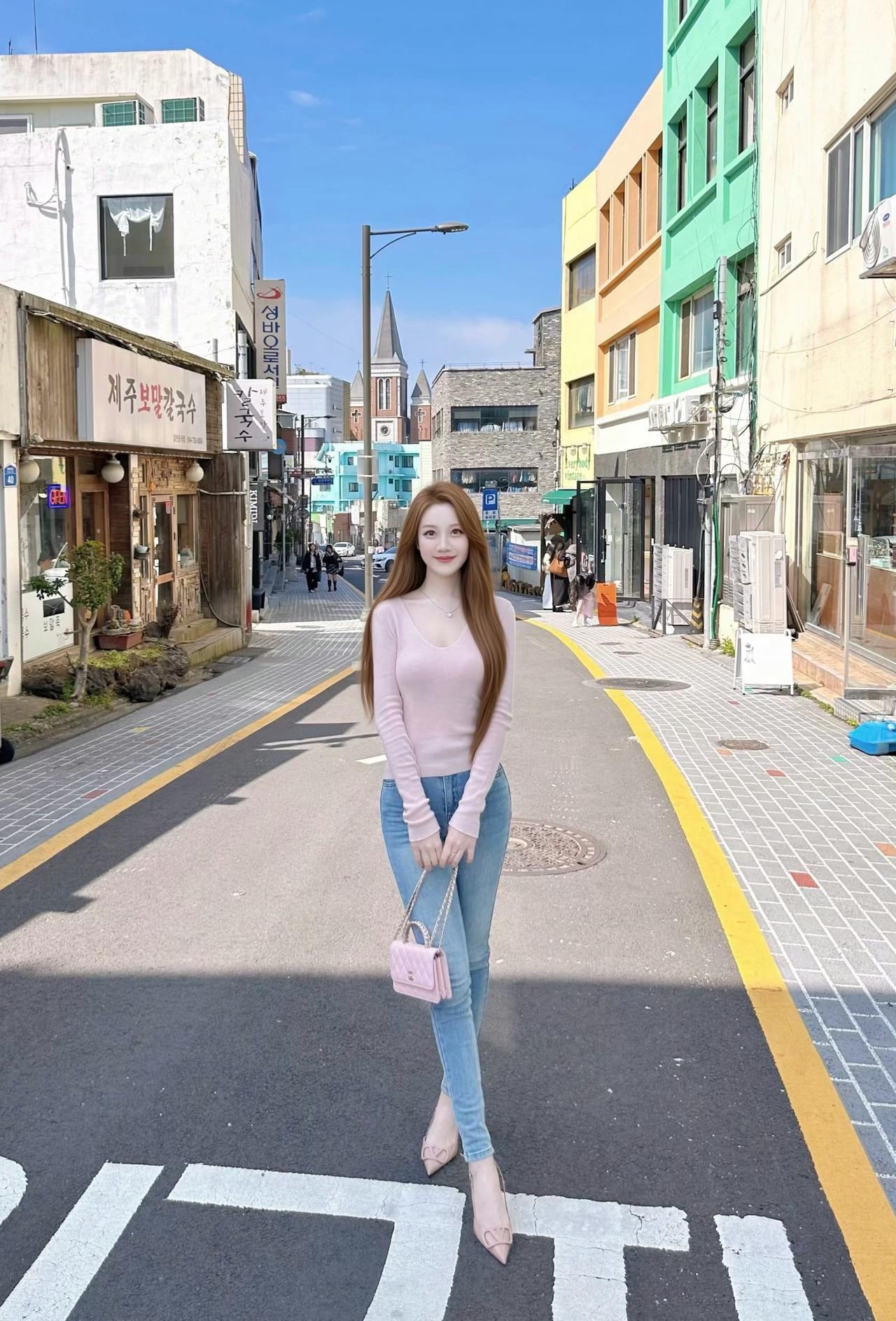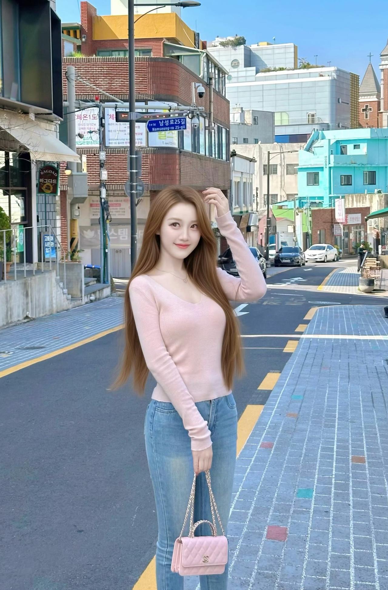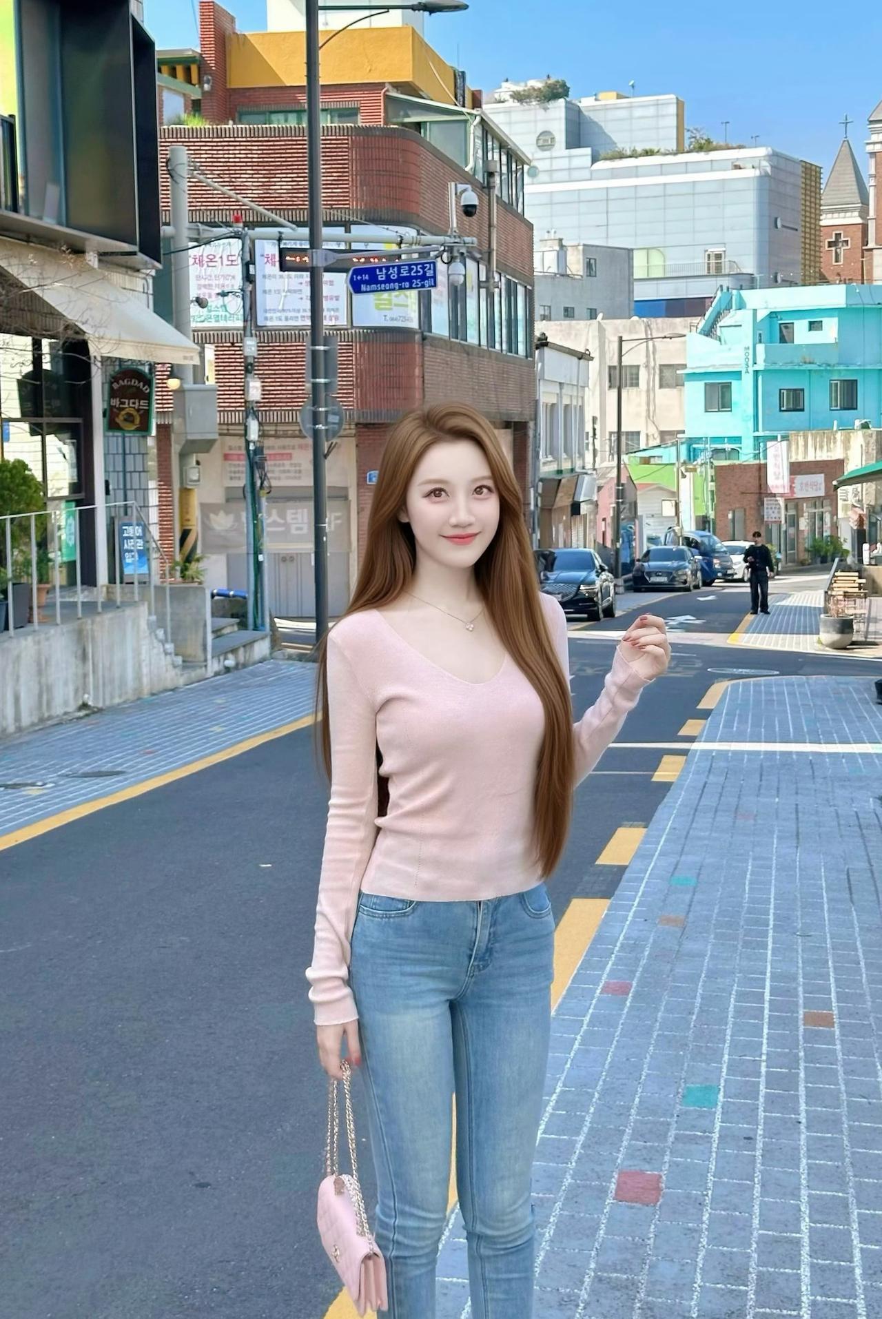 首尔街头的风,带着阳光的温度。浅粉针织衫搭配牛仔裤,把温柔和松弛感都穿在了身上,随手一拍都是韩剧女主的日常。