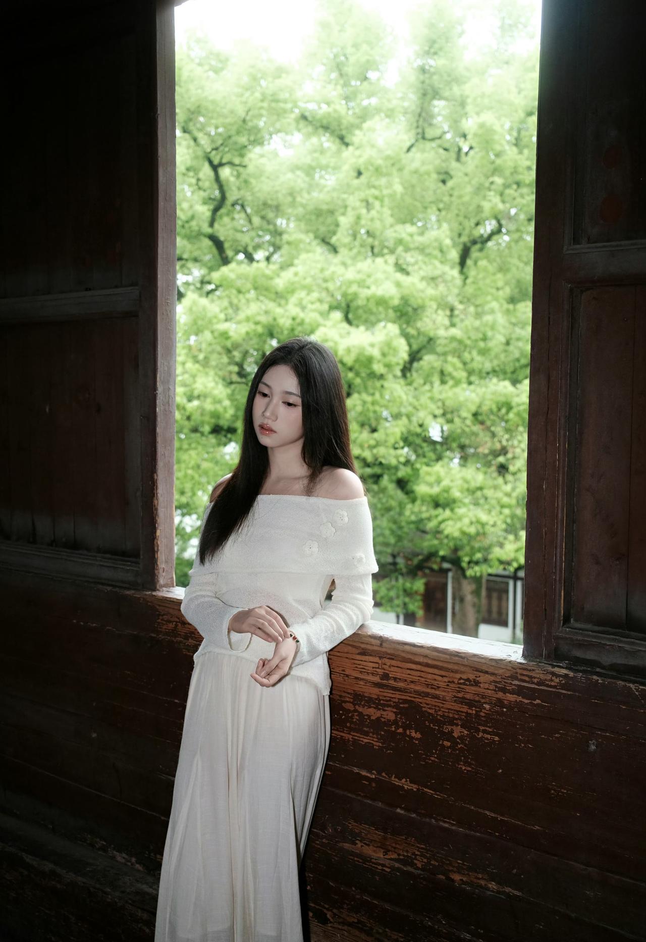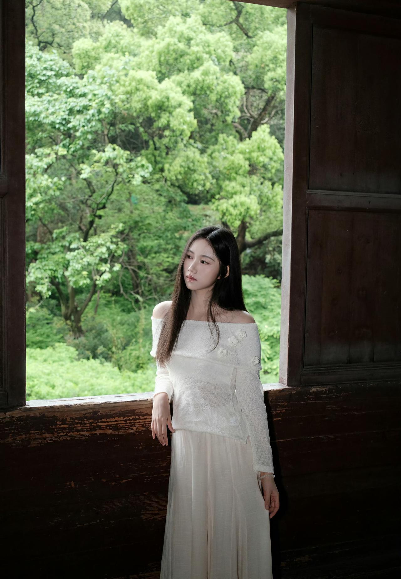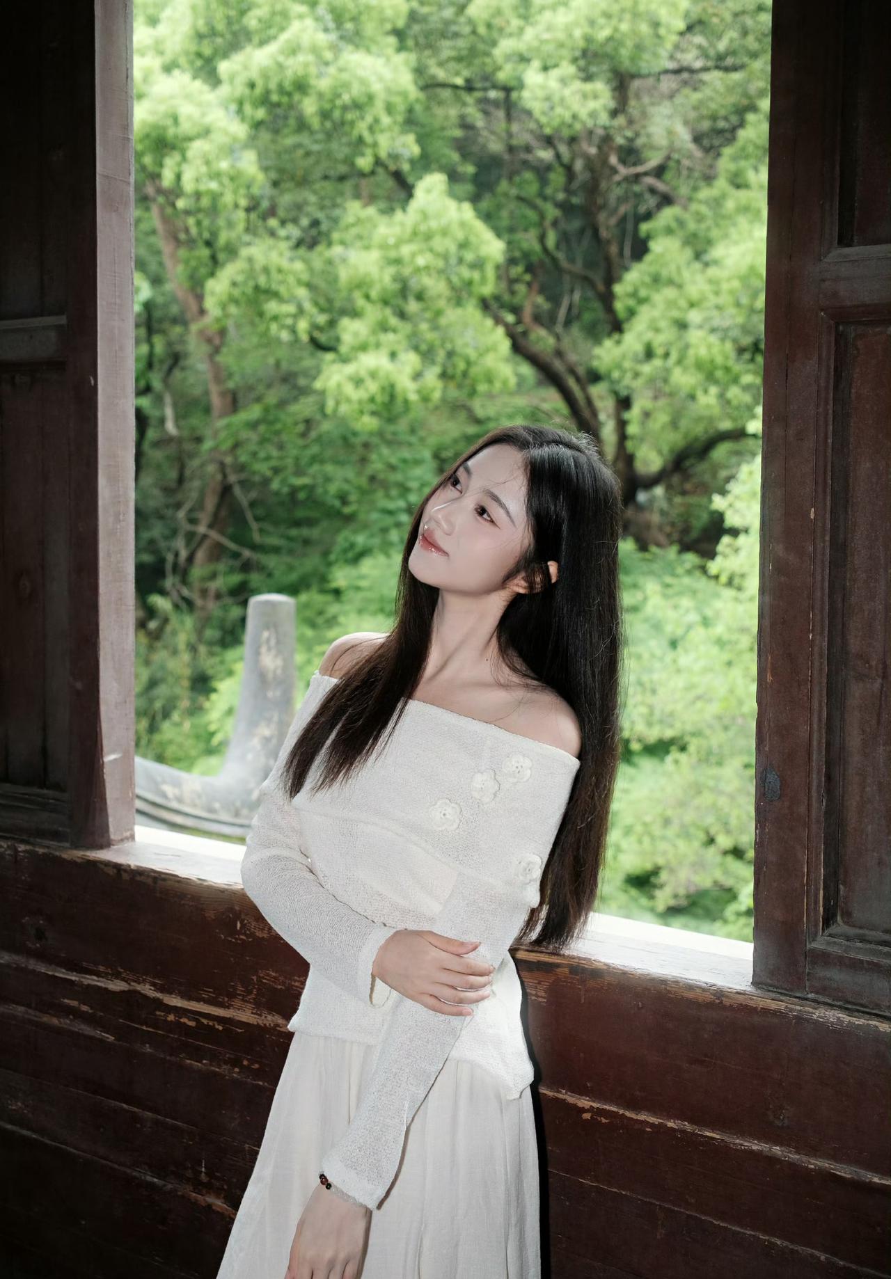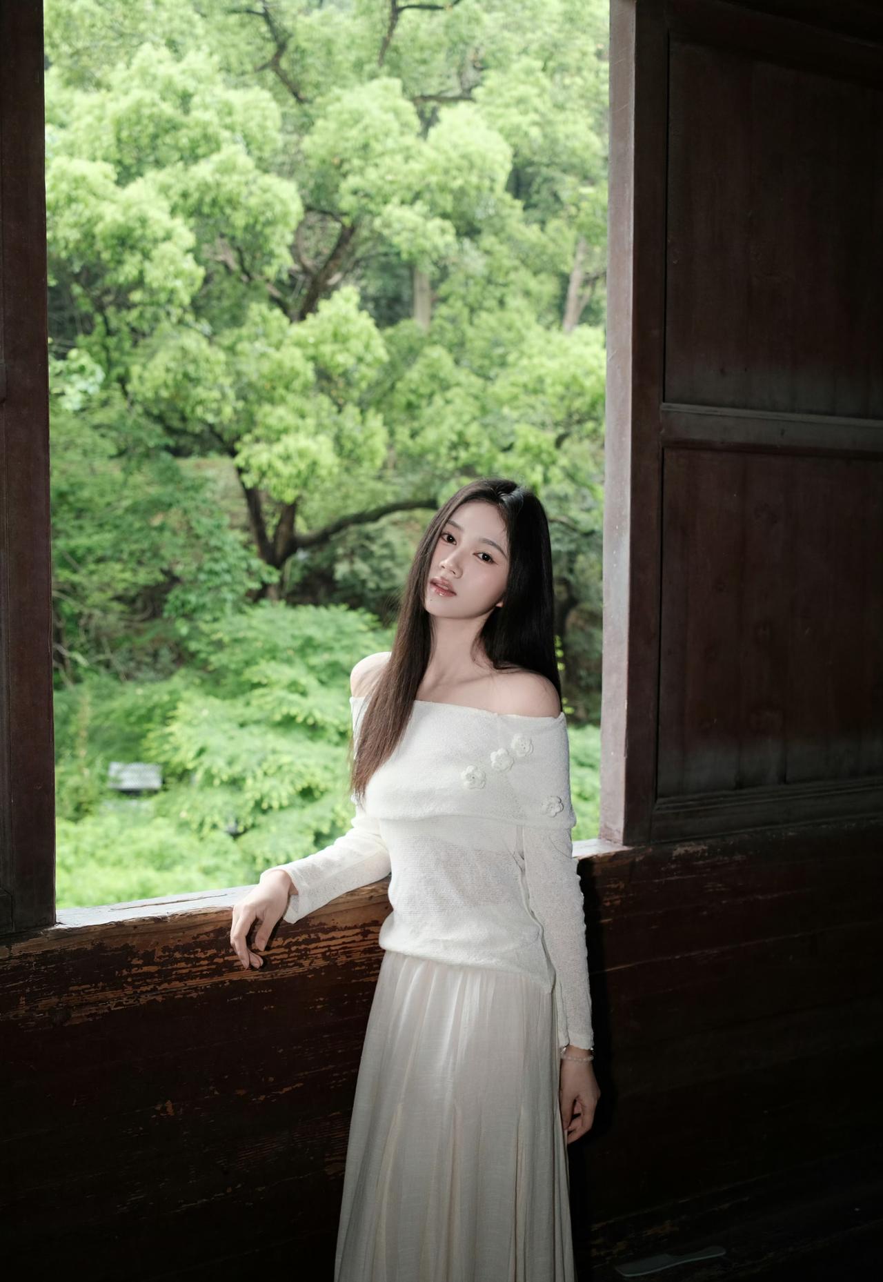 白色露肩上衣搭配浅色长裙,绿意盎然,清新自然,享这一刻的宁静。