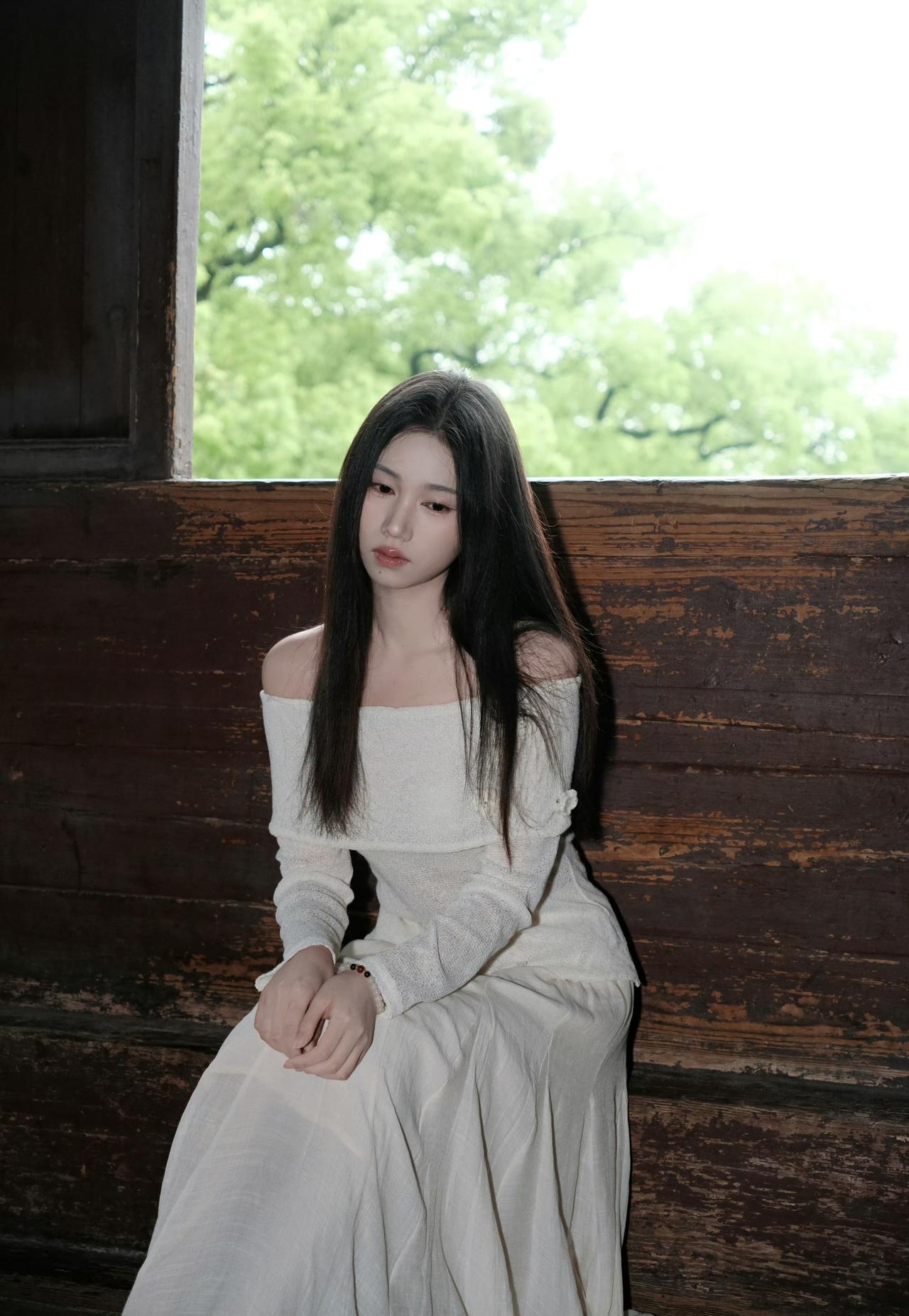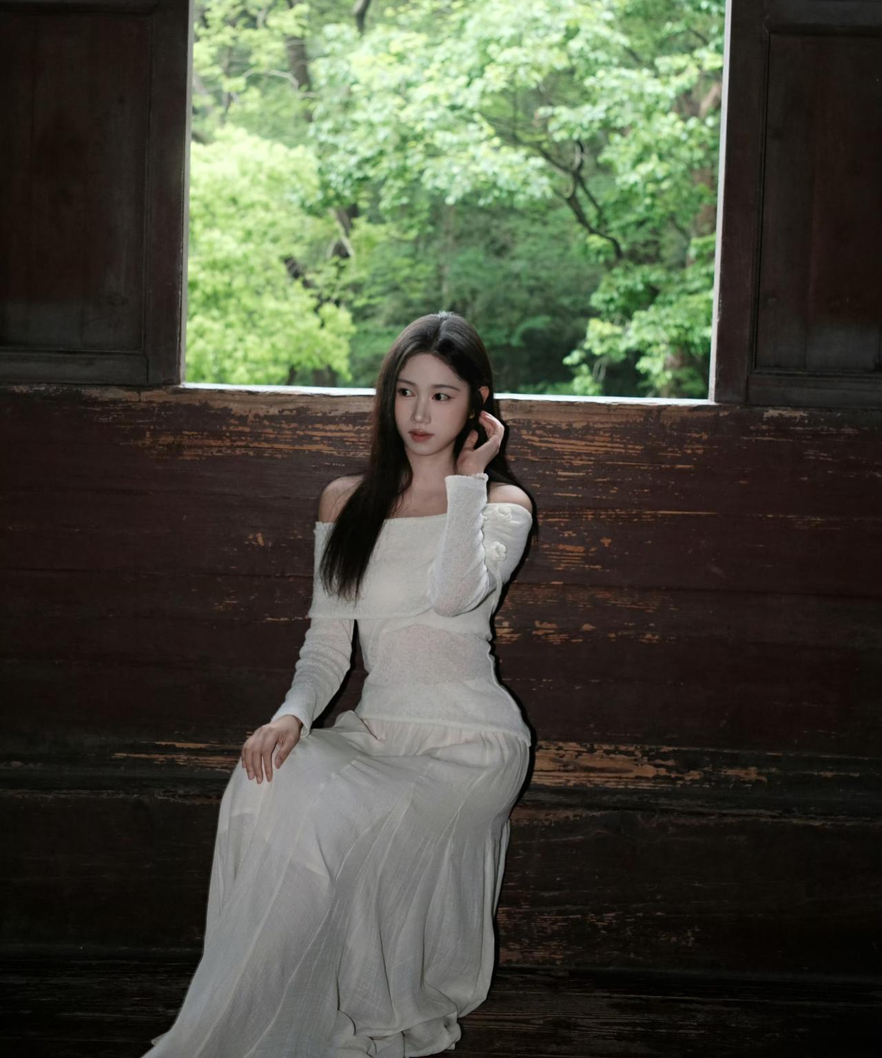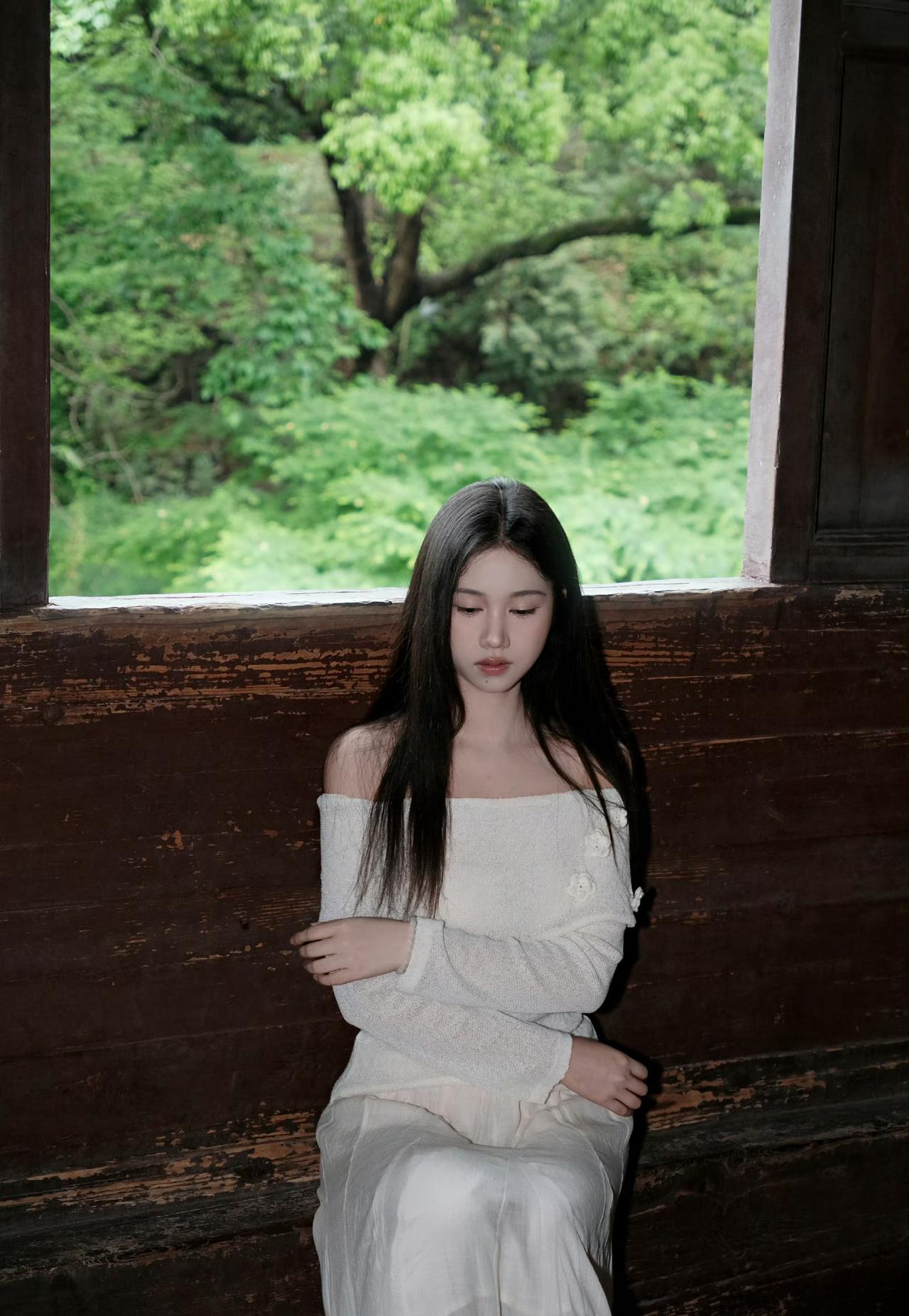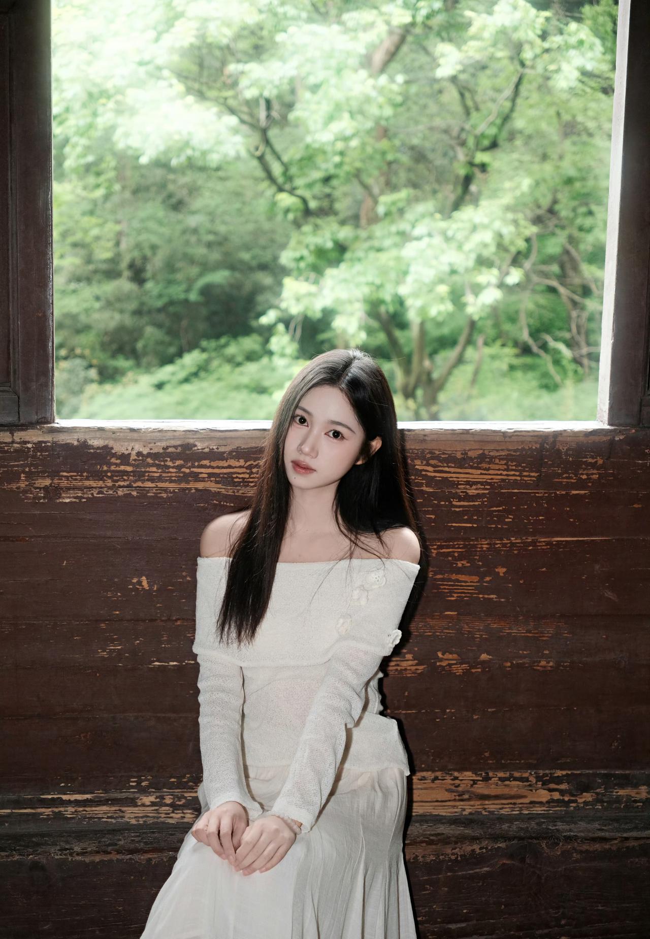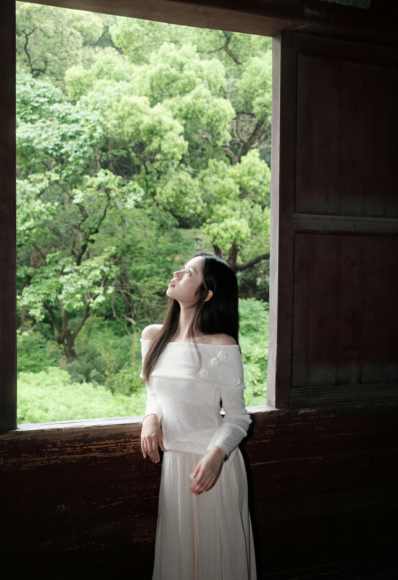 白色露肩上衣搭配浅色长裙,绿意盎然,清新自然,享这一刻的宁静。