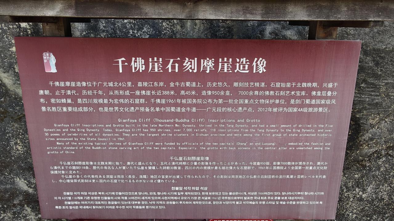 广元的千佛崖始于北魏,一直有补刻,是四川境内最大摩崖石刻群。皇泽寺也是建于北魏,出生地故,武则天屡次敕封,内有石窟造像1203尊,最后一尊是武则天晚年的真容。