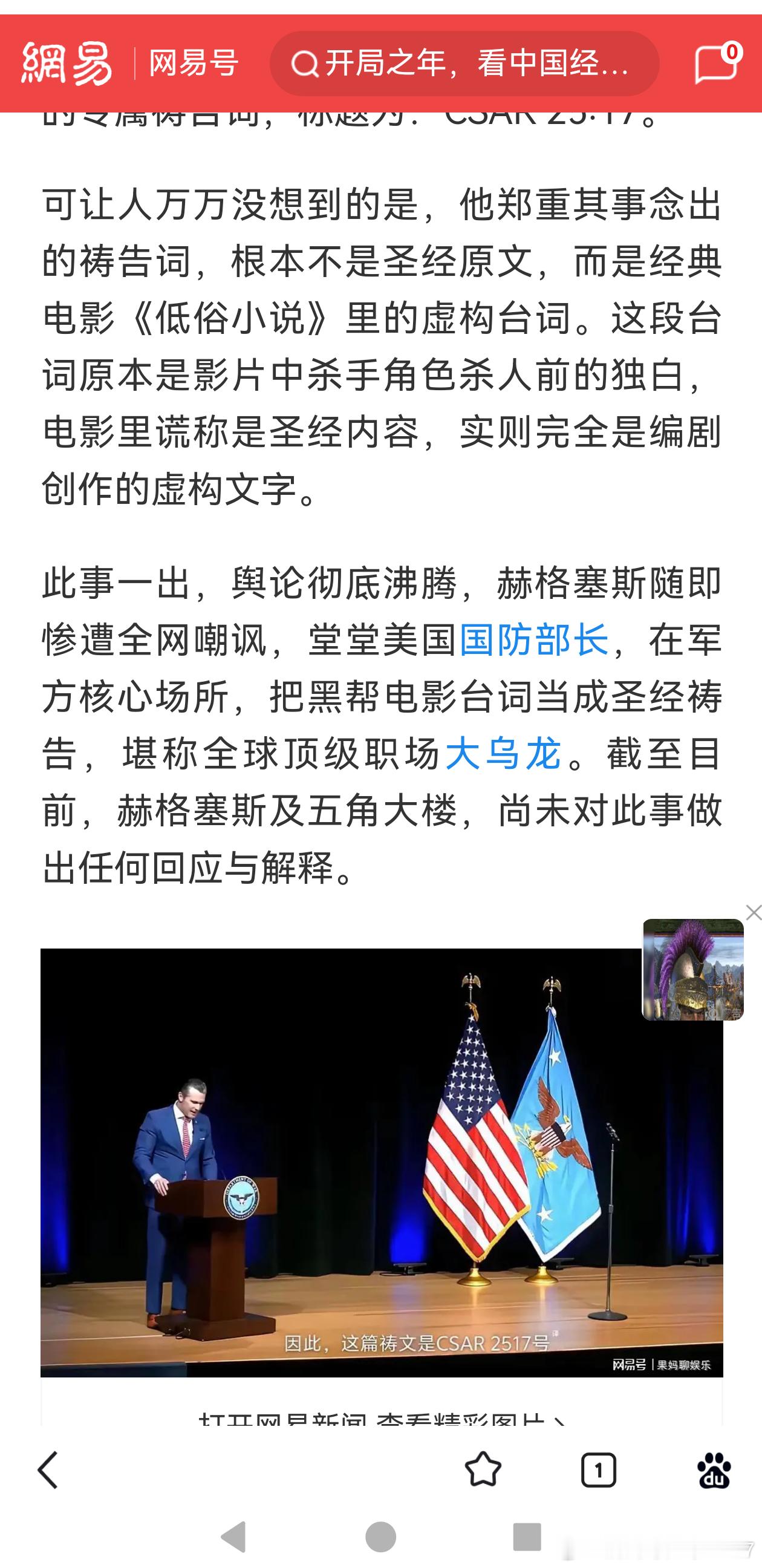 他手持稿件,神情严肃地念出一段所谓的圣经经文,还声称这段文字出自《圣经·以西结书》25章17节,是针对美军救援行动的专属祷告词,标题为:CSAR 25:17。