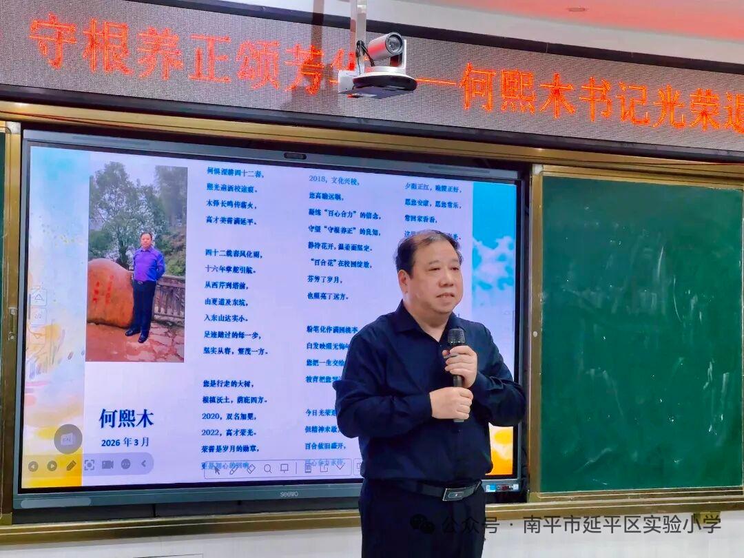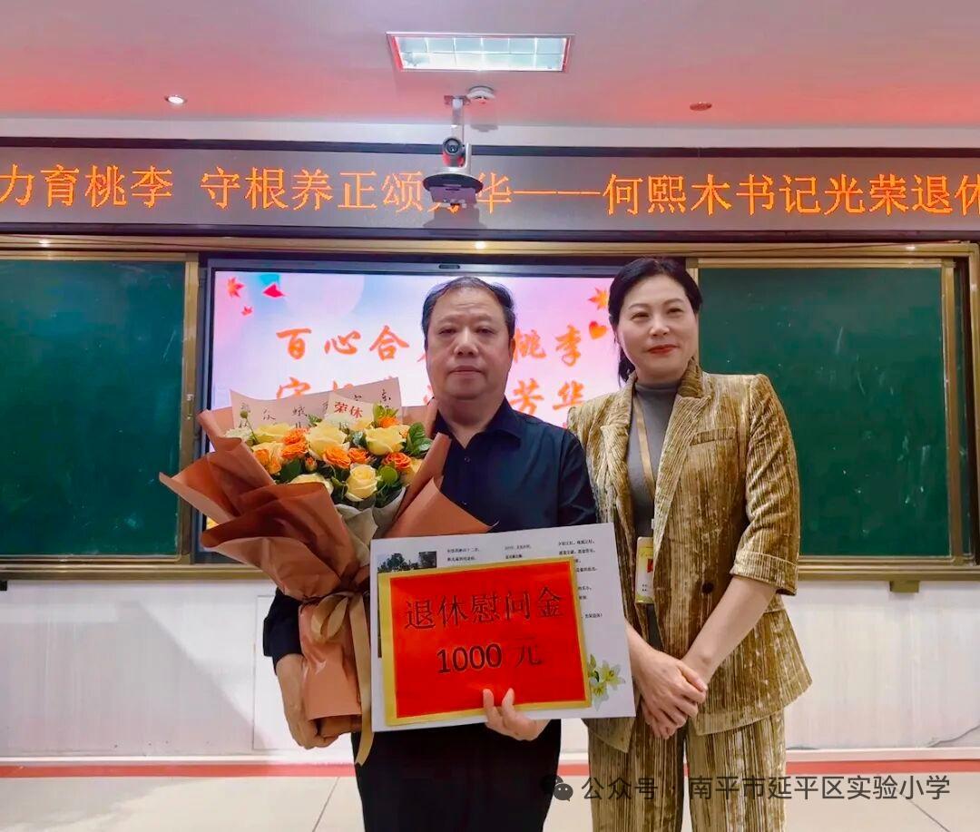 福建延平区实验小学何熙木老师荣休仪式 3月30日举行,工会副主席吴燕钦开场致辞,陈清玉校长与工会主席吴雪芬为何熙木书记送上鲜花和“光荣退休”证书,陈校长讲话。