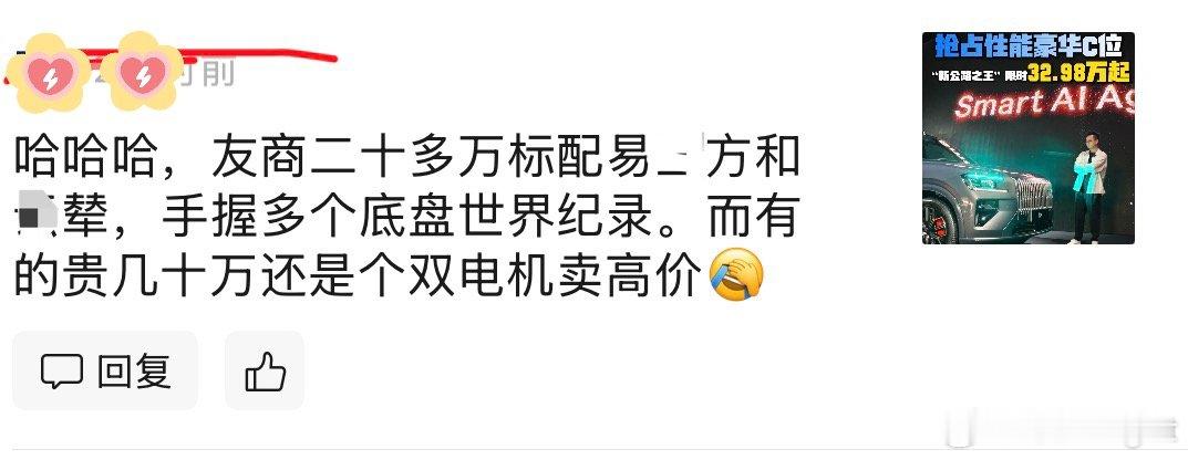 刷到一条评论挺有意思的,网友说友商已经用更低的价位做到了,标配这啊那啊,还质疑极氪8X的定价。