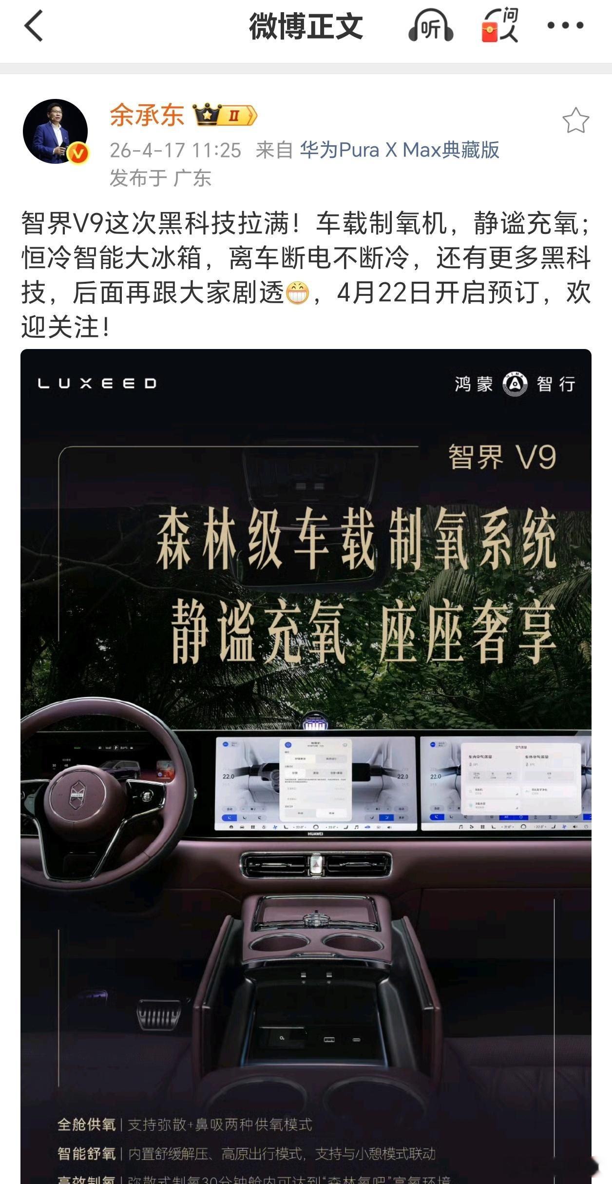 【华为余承东:智界V9将搭载车载制氧机、离车断电不断冷的大冰箱】