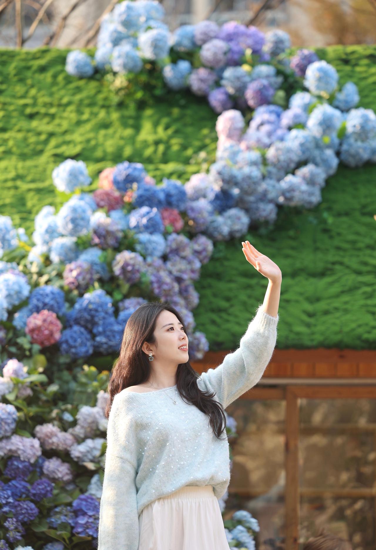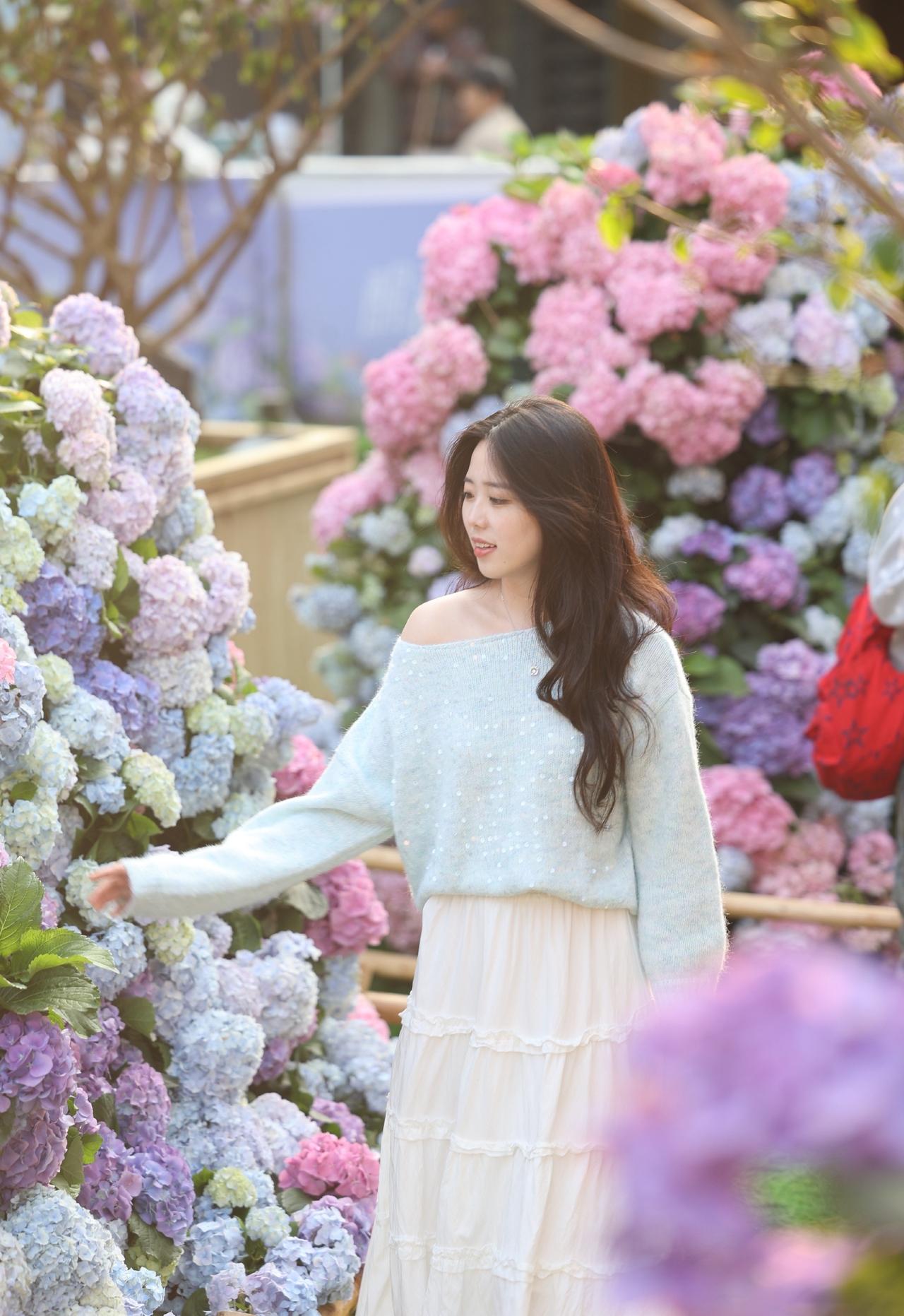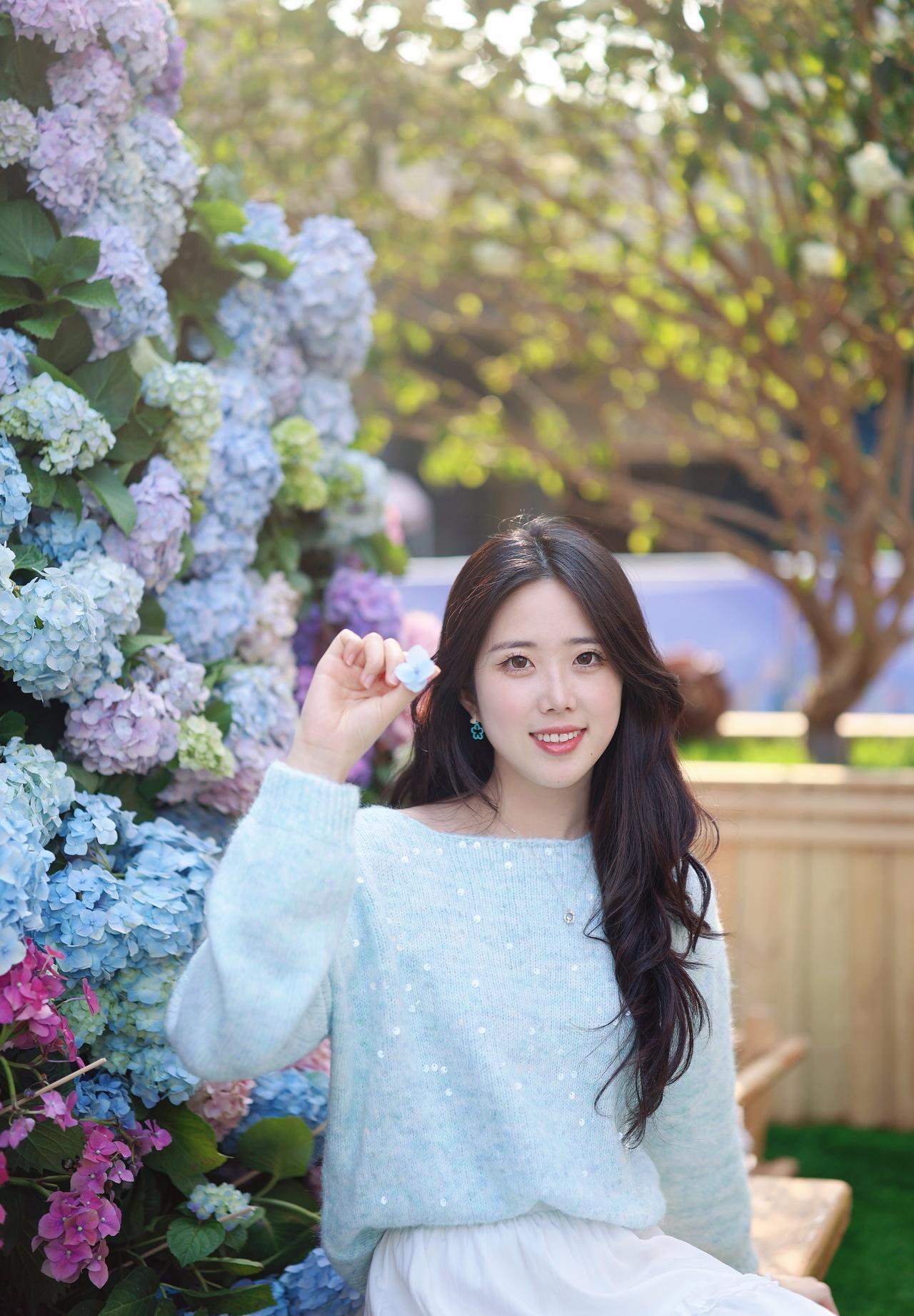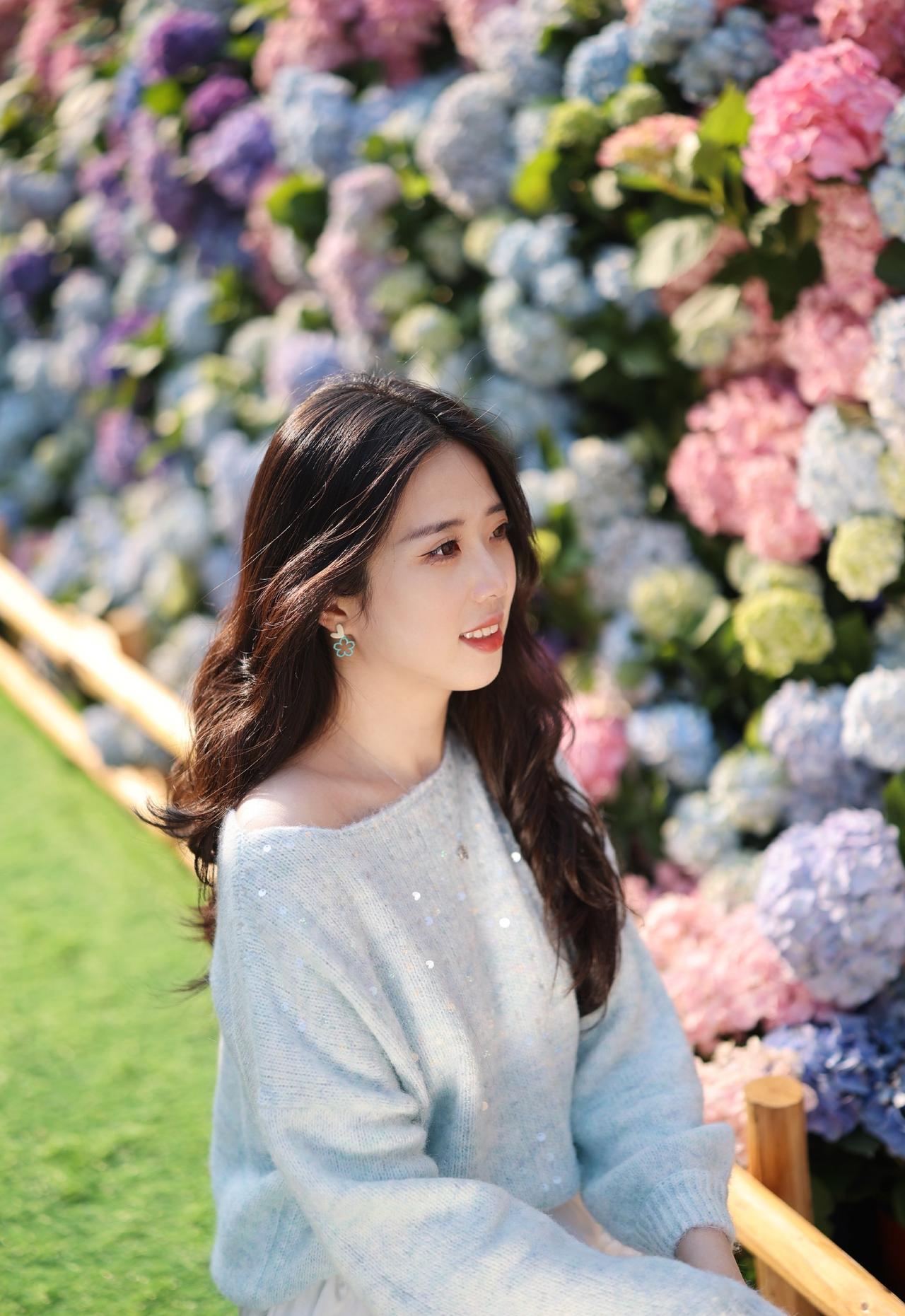 浅蓝色带亮片的露肩毛衣+白色长裙,长发披肩,面带微笑,感受着绣球花的美。