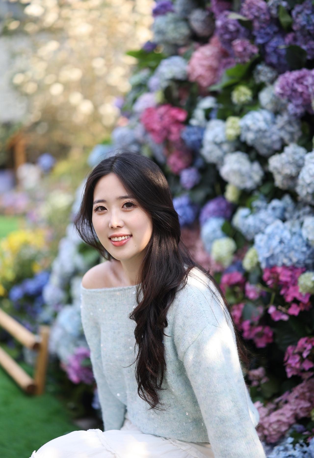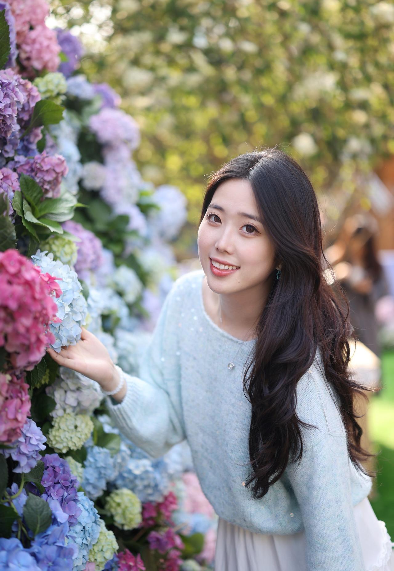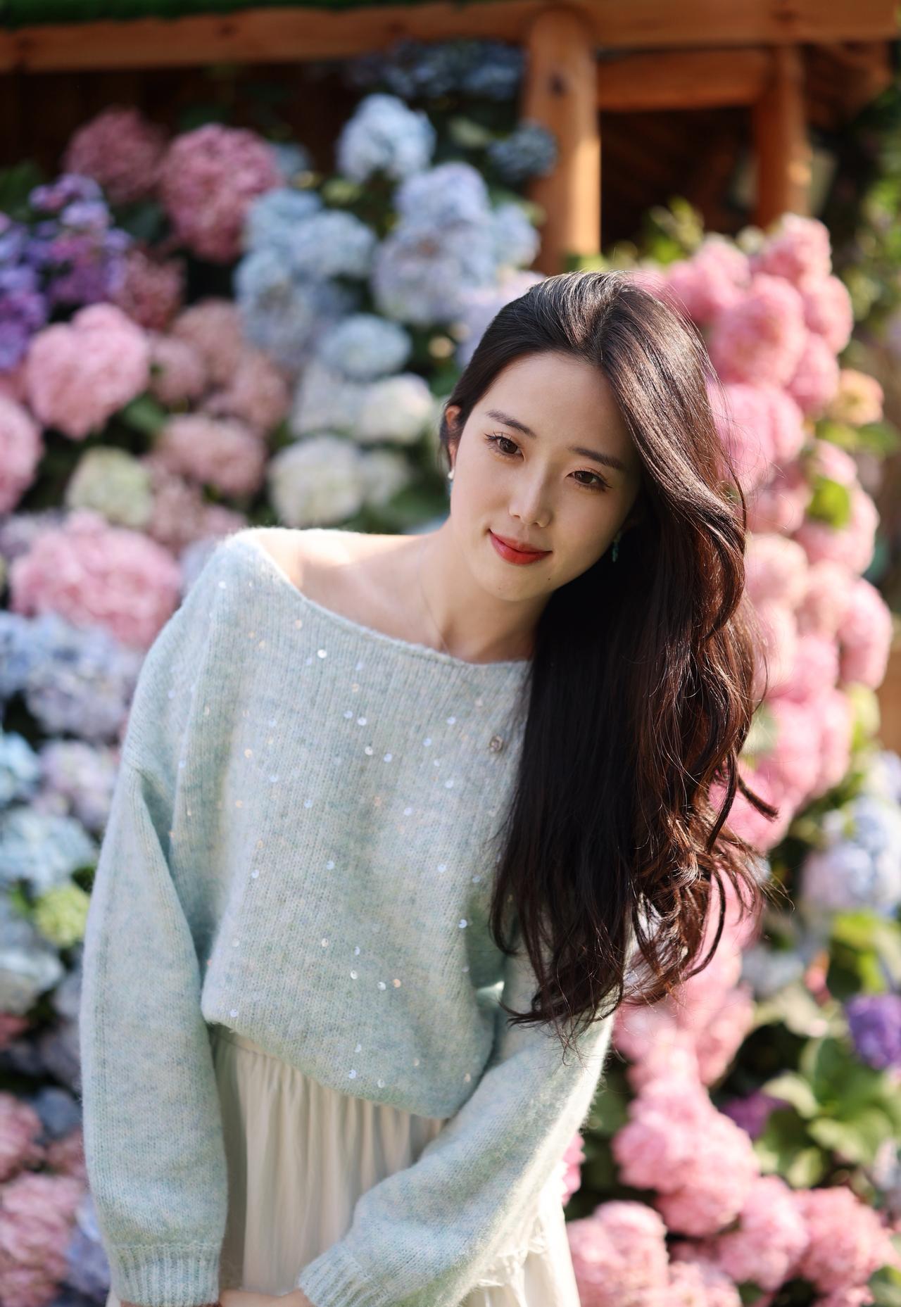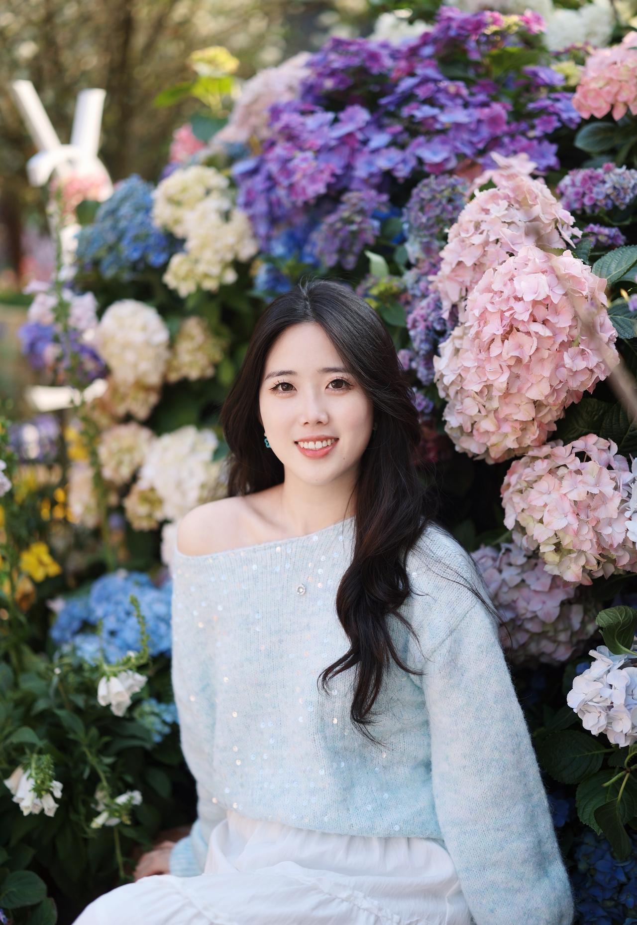 浅蓝色带亮片的露肩毛衣+白色长裙,长发披肩,面带微笑,感受着绣球花的美。