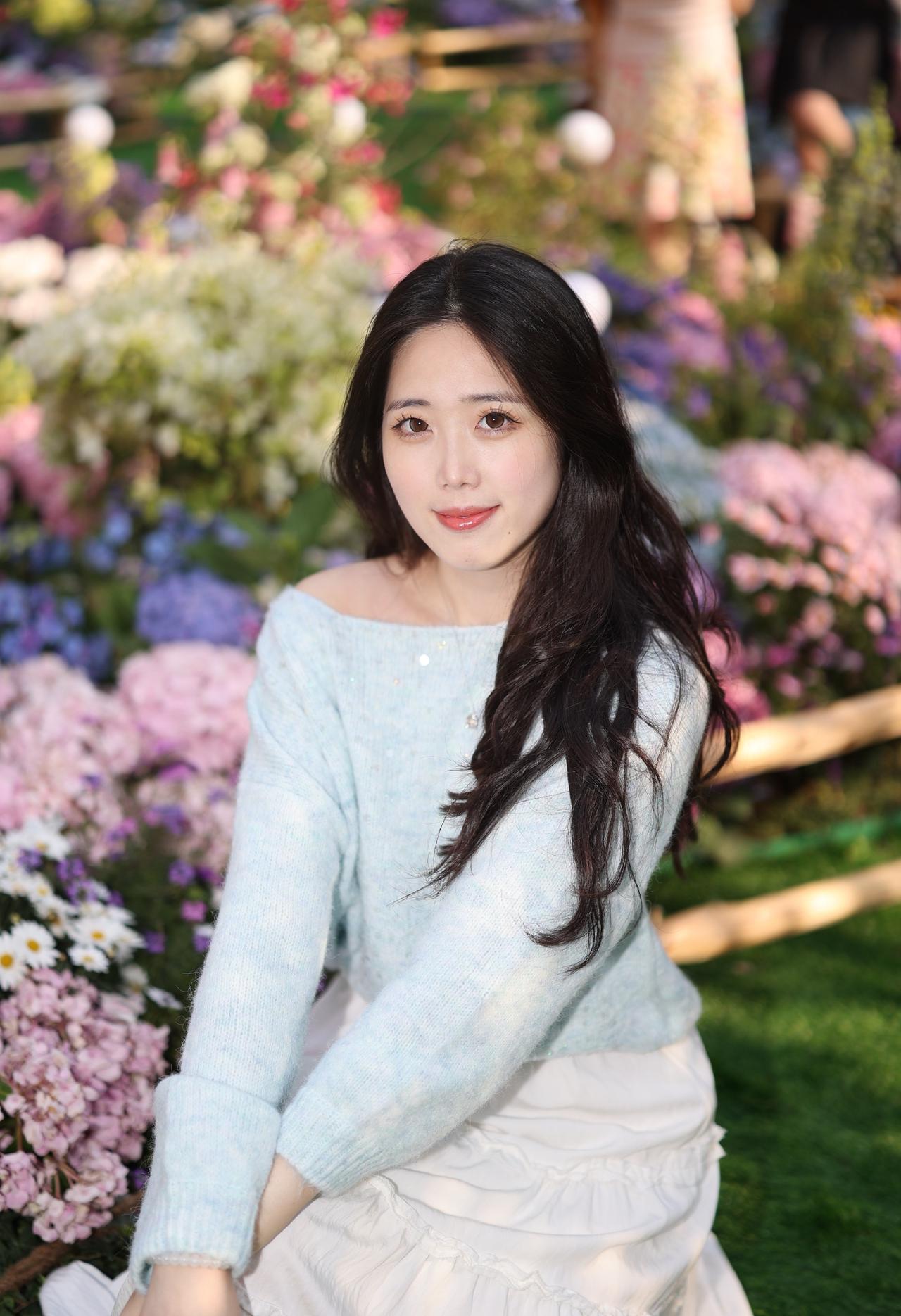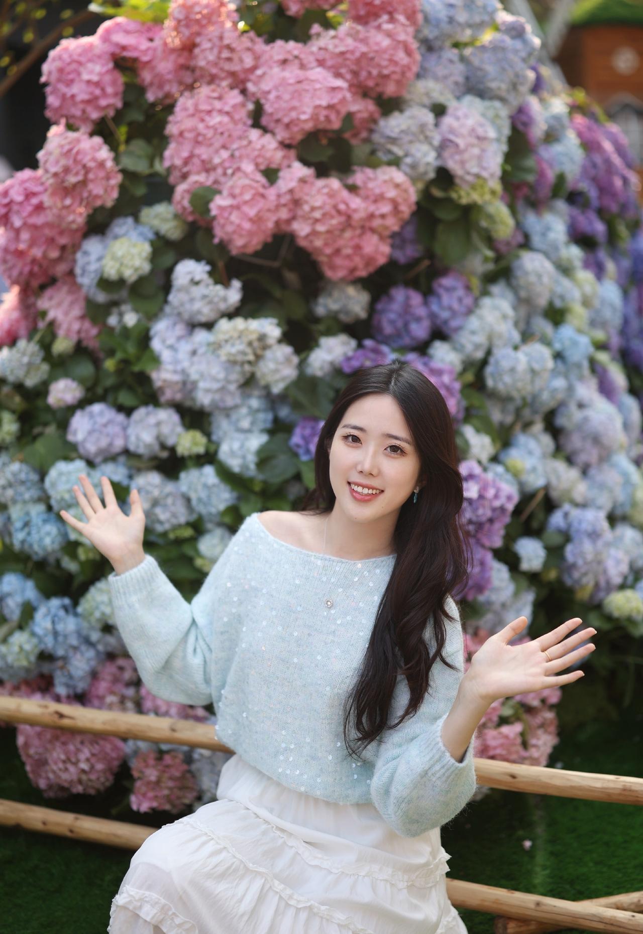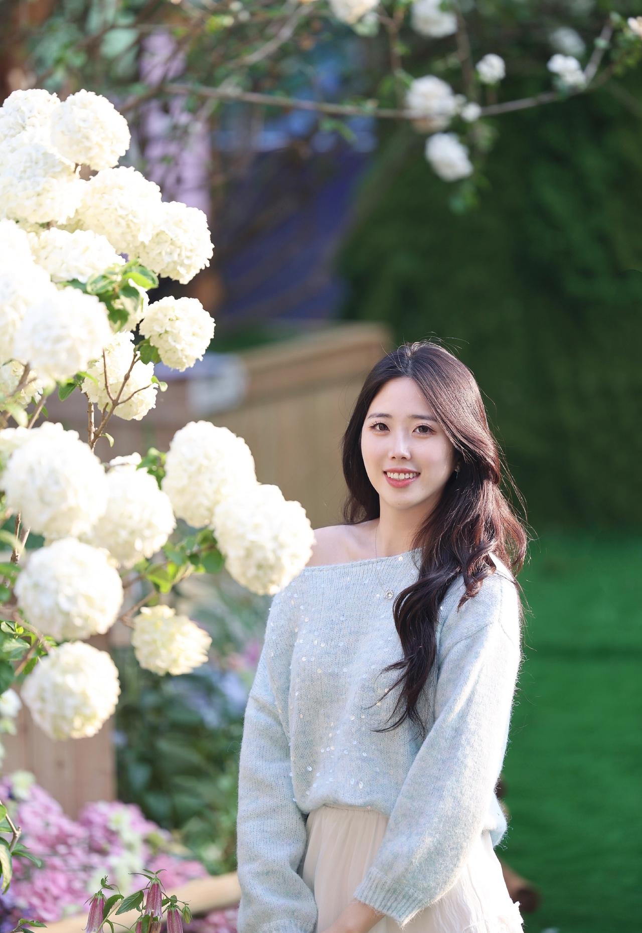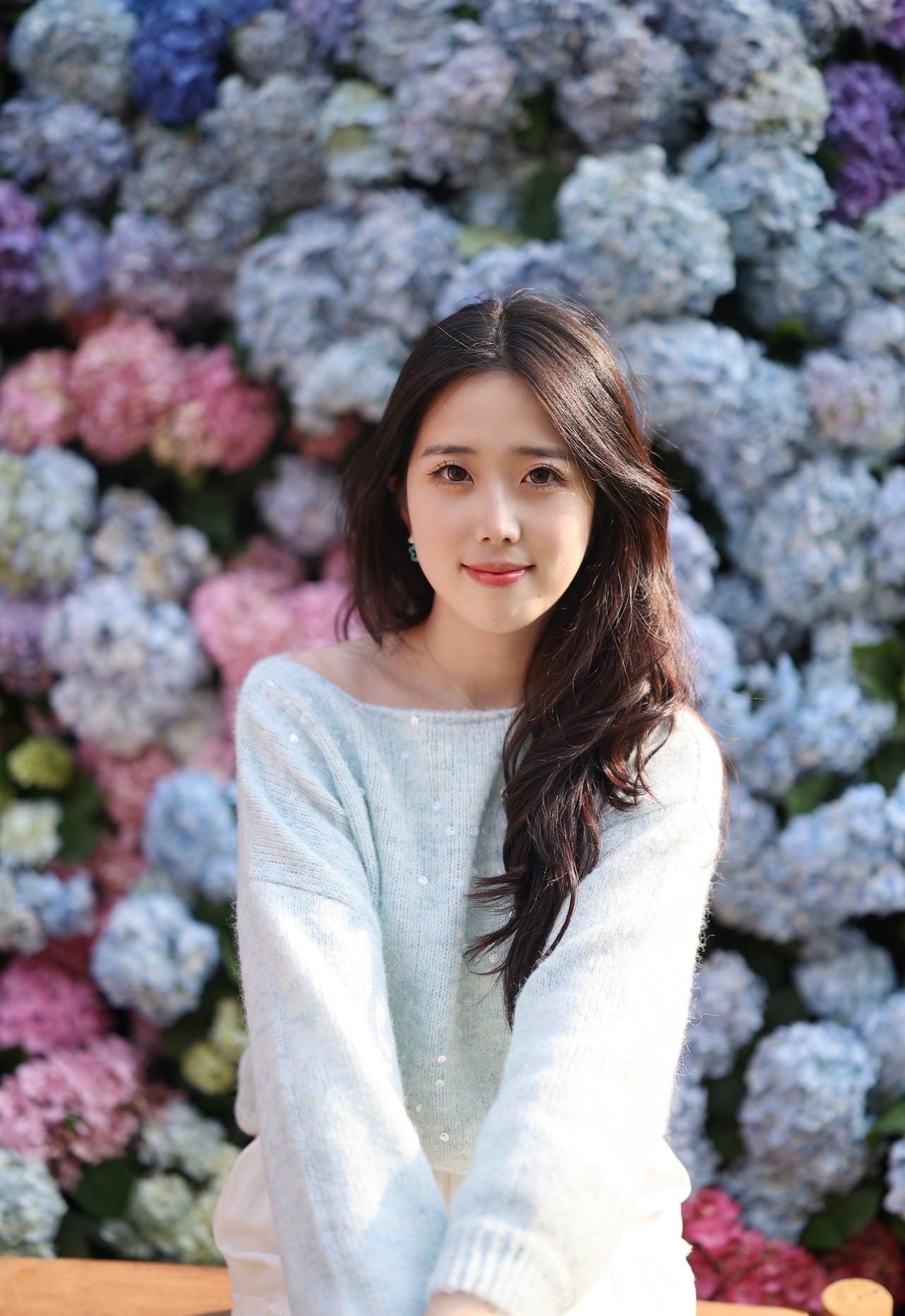 浅蓝色带亮片的露肩毛衣+白色长裙,长发披肩,面带微笑,感受着绣球花的美。