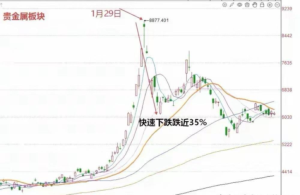 我们先来看两个例子:第1个例子来自于近期贵金属板块的一轮逼空行情。从下图当中大家可以看到,贵金属本轮逼空行情走势非常的强劲。但是随后贵金属板块迎来了一轮垂直下跌。短短几个交易日制高点的跌幅接近35%。