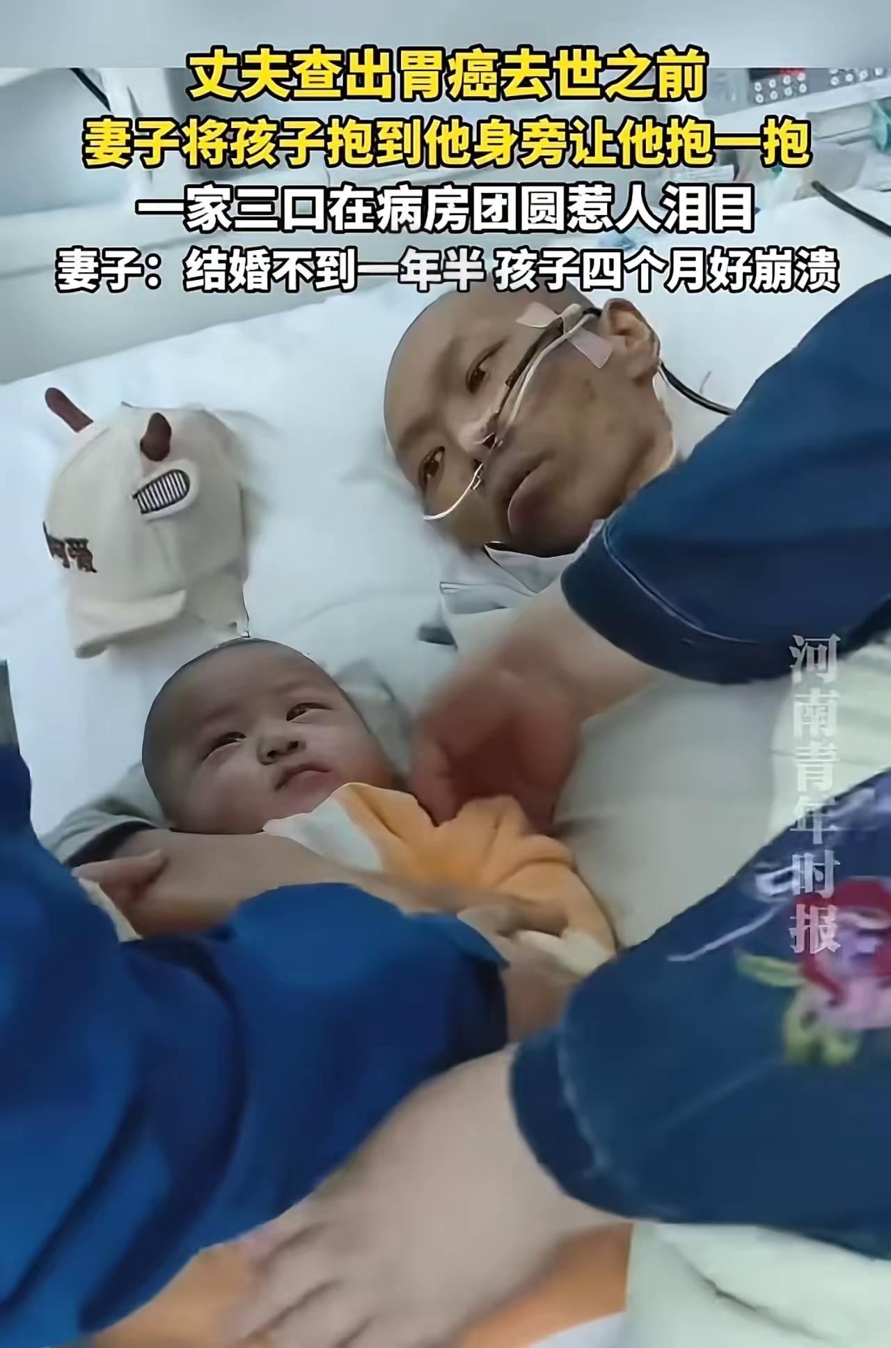 相守不过一年半,生死相隔在病床,四个月稚子从此缺失父爱 (个人观点仅供参考,无任何不良引导) 情深缘浅最是无奈,世事难料最动人心。谁见过这般催人泪下的生离场面。一段崭新的姻缘,一场猝不及防的重病,硬生生拆散安稳和睦的三口小家。 一纸诊断击碎所有美好憧憬。大好年纪的青年丈夫确诊重度胃癌。病痛无情蚕食鲜活的身躯。曾经意气风发的模样荡然无存。单薄的身躯蜷缩在病房病床之上。涣散的眼神藏不住生命走到尽头的无助。周遭安静得落针可闻。浓烈的悲凉裹挟病房里的每一寸空气。 年轻的妻子强忍心底翻涌的悲恸。默默将家中四个月大的小宝宝抱至病床跟前。温柔俯身贴合虚弱的丈夫。只想让父子之间多一点贴身相伴的温存。襁褓中的孩童懵懂天真。咿呀嬉闹不知人间疾苦。挥动的小手贴近憔悴的父亲脸庞。这般画面怎能不让旁观者湿了眼眶。 弥留之际的男子满心牵挂妻儿。拼尽全身余力想要触碰怀中孩子。微弱的力道撑不起抬手的动作。无力的臂膀重重落下便再无动静。朝夕相伴的爱人近在咫尺却留不住分毫。美满的生活怎么就走到了尽头。短短一年半的婚姻时光。刚体会家庭圆满的幸福滋味。刚迎接新生命奔赴人间烟火。残酷的别离就打破所有美好期许。女子瞬间卸下所有坚强。无声的泪水浸湿衣襟。心底的靠山就此轰然崩塌。 人生祸福朝夕难测,平安团圆便是人间顶配。好好珍惜身边相伴的亲人。认真过好当下的每一寸光阴。别等离别降临才懂陪伴有多珍贵。