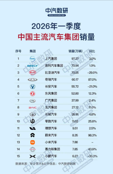 排名第一的是上汽集团,2026年第一季度销量达到97.27万辆。相信下个季度可以突破100万辆以上,大家拭目以待吧。