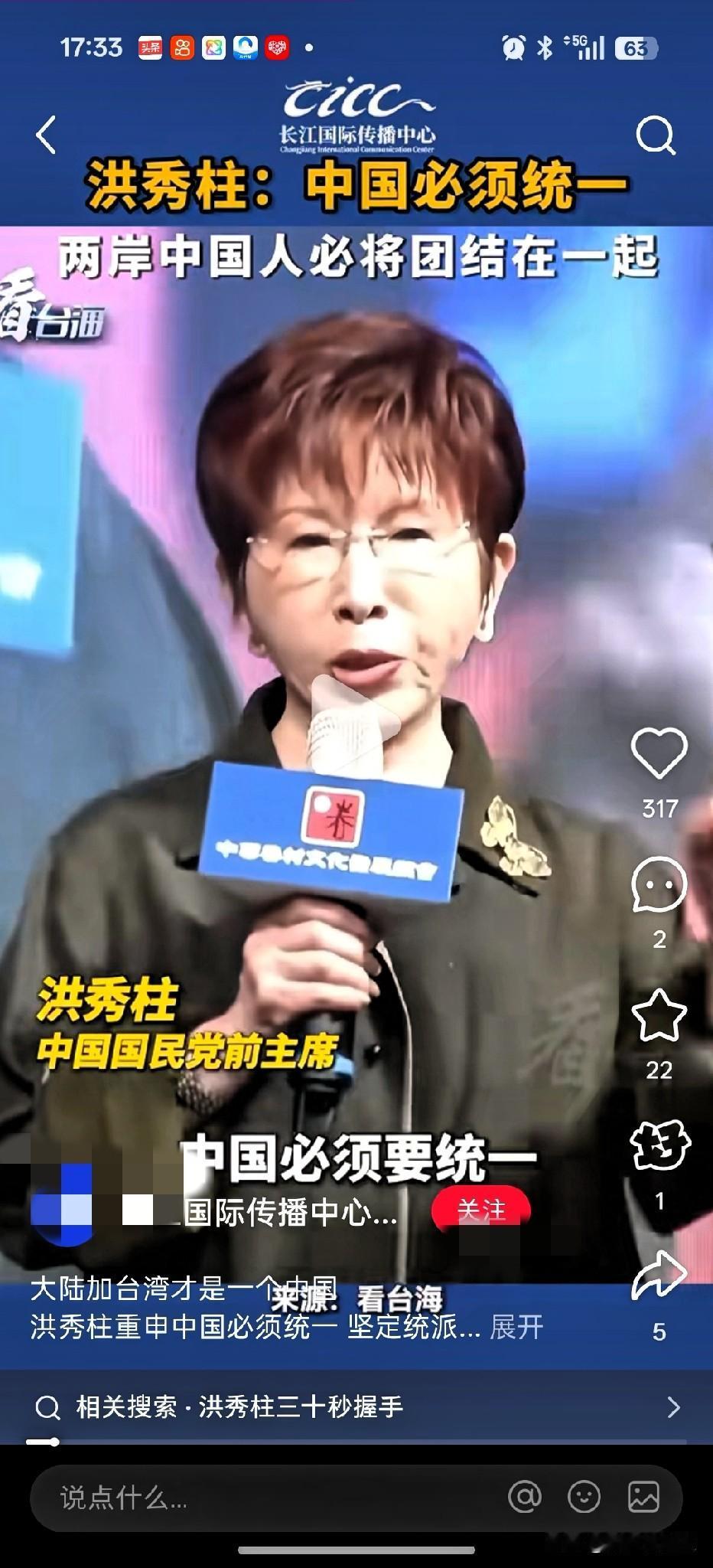 4月17日,第七届台胞社团论坛在北京召开。国民党前主席洪秀柱发表讲话称“两岸必须统一,必然统一”。 洪秀柱表示,两岸同胞是一家人,统一是历史必然,分裂只会让民众受苦。洪秀柱说,统一才能让两岸人民过上更好的生活。洪秀柱呼吁大家团结发展,共同爱护家园。洪秀柱的言论引发网友热议,纷纷支持统一,认为这是民心所向。洪秀柱始终支持统一,展现格局与担当。