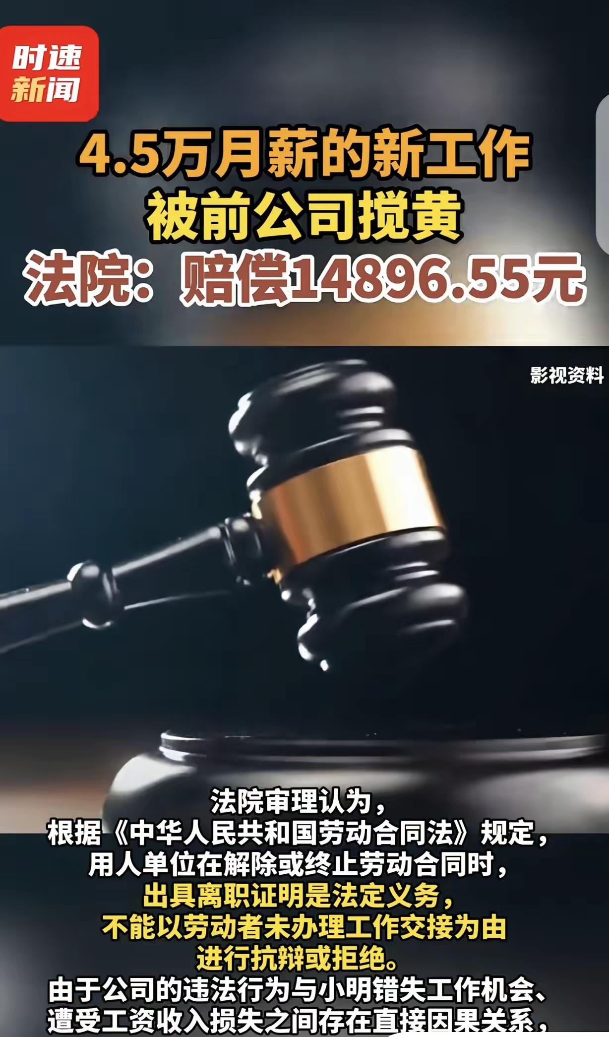 缺大德了!”广东深圳,一男子辞职后,找了份月薪45000元的工作,可把他乐坏了,万万没想到,前公司竟然给他搅黄了,说他“工作交接没完成”,就是不给他开离职证明。新公司一看男子这么大的麻烦,直接撤回录用通知,男子勃然大怒,直接把前公司告上法庭,法院判决给前公司当头一棒。 这名男子叫小明(化名),今年33岁,在深圳互联网行业打拼了10年,是一名资深技术工程师。他在原公司任职6年,从普通程序员做到技术主管,手里握着多个核心项目的技术架构和客户资源,是团队里不可或缺的骨干。他之所以决定跳槽,是因为原公司近几年业务收缩,薪资常年不涨,还频繁加班,身体和精神都不堪重负,想换个平台谋求更好的发展。 今年3月初,小明开始投递简历,凭借扎实的技术功底和丰富的项目经验,他顺利通过一家头部科技公司的5轮面试,拿到了技术总监的录用通知,月薪45000元,还附带15薪、股票期权和高额年终奖。这是他职业生涯的重大突破,薪资比之前翻了近3倍,他激动得整晚没睡,第一时间把喜讯告诉了妻子和父母,一家人都为他高兴。 按照劳动法规定,小明提前30天向原公司提交了书面辞职申请,并且全身心投入工作交接。他把负责的4个核心项目代码、服务器权限、客户对接资料、项目进度台账全部整理成册,逐一对接给接手的同事,每一项都标注得清清楚楚,还留下自己的联系方式,承诺后续有任何问题随时解答。连续20多天,他每天都忙到晚上11点才下班,就为了把交接工作做到万无一失,部门主管也在交接清单上签字确认,认可所有工作全部完成。 可到了离职当天,小明去HR部门办理手续、索要离职证明时,却被HR直接拒绝。对方给出的理由就是“工作交接未完成”,还额外找了一堆借口,说他“没有归还服务器密钥”“把公司资料上传到个人网盘”“项目遗留问题没解决”。这些理由全是无稽之谈,小明当场拿出交接清单、聊天记录、监控录像等所有证据,证明自己已经完成全部交接,可HR依旧态度强硬,死活不肯开具离职证明。 小明后来才知道,原公司是因为核心项目突然出了问题,急需他这样的技术骨干救场,才故意用拒开离职证明的方式刁难他,想逼他回公司继续工作。他急得团团转,一边反复跟原公司沟通协商,一边向新公司解释情况,可新公司有着严格的入职流程,没有离职证明就无法办理入职、无法开展背景调查,更担心他与原公司存在劳动纠纷,会给公司带来风险。即便小明多次提交证据、反复解释,新公司还是在等待两周后,正式向他发出录用通知撤回函,这份唾手可得的高薪工作,就这样彻底泡汤。 这份工作对小明来说意义重大。他在深圳背负着近200万的房贷,每个月还款1.2万,妻子全职照顾孩子,孩子刚上小学,学费、生活费、房贷、车贷全靠他一个人支撑,这份高薪工作能彻底缓解他的经济压力,也能让家人过上安稳日子。被原公司这么一搅和,他不仅丢了工作,还陷入“旧岗已辞、新岗落空”的困境,经济和心理双重压力让他几近崩溃,多次沟通无果后,他毅然拿起法律武器,向深圳市劳动仲裁委员会申请仲裁,随后又向法院提起诉讼,要求原公司赔偿全部经济损失。 法庭上,原公司依旧以“工作交接未完成”作为抗辩理由,试图逃避责任。可法院审理后直接驳回了这一说法。根据《中华人民共和国劳动合同法》第五十条明确规定,用人单位应当在解除或者终止劳动合同时出具解除或者终止劳动合同的证明,这是企业必须履行的法定义务,不能以任何理由、任何条件加以阻挠,工作交接与开具离职证明分属不同法律关系,不能以此作为拒开证明的借口 。法院还指出,原公司拒绝开具离职证明的行为,与小明错失高薪工作、遭受工资收入损失之间存在直接因果关系 。 最终,法院判决原公司限期为小明开具离职证明,同时赔偿小明因无法入职新公司产生的工资损失、维权产生的律师费、交通费等各项费用共计14896.55元 。这个判决,不仅维护了小明的合法权益,也给所有恶意刁难员工的企业敲响了警钟。 职场中,员工依法享有平等就业、自由择业的权利,企业不能凭借自身优势地位,肆意侵犯员工合法权益,更不能把手中的管理权限变成打压员工的工具。身为用人单位,理应遵守劳动法律法规,妥善处理员工离职事宜,恶意阻挠只会付出法律代价,既损害企业声誉,也要承担经济赔偿。每一位劳动者都要学会拿起法律武器保护自己,遇到企业恶意刁难、拒开离职证明等情况,一定要保留好证据,通过合法途径维权。 各位读者你们怎么看?欢迎在评论区讨论。
