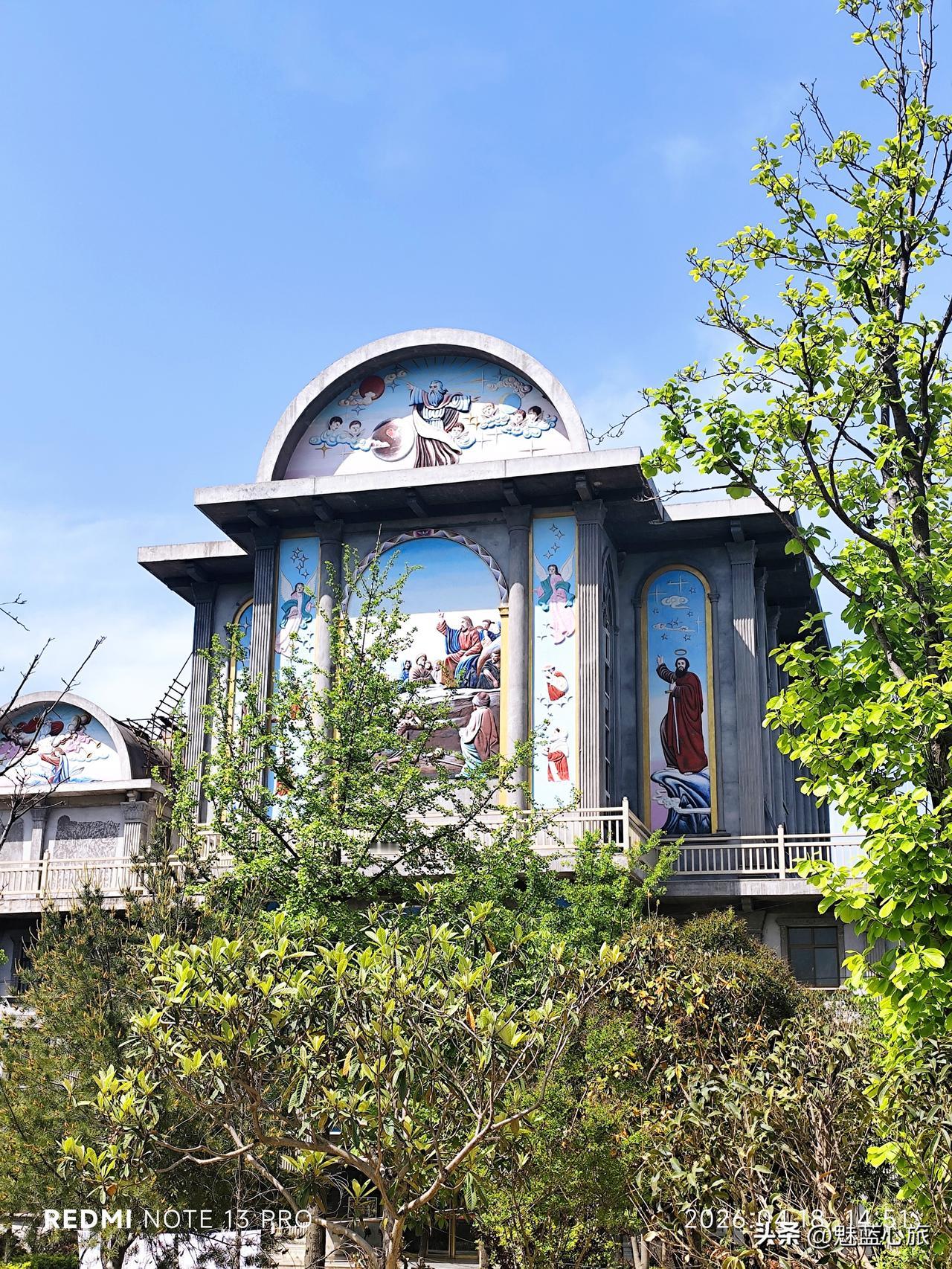 今天来到西安户县的圣母宫,真是长见识了。沿关中环线周至方向,左拐进入一条狭窄的上山小路,一路田园风光,山路曲折,草木丛生,车行其间,还有点探秘之感。 来到山上,圣母宫便浮现眼前了,里面没有开门,周围看起来也有点荒芜。其实这座教堂在2000年就开建了,不是废弃,是至今都没有完工... 这座坐落于秦岭浅山的建筑,有着几分独特的异域气质,教堂上画作是《最后的晚餐》,在关中山野里显得有点特别,看到来这的人陆陆续续,让落寞的建筑有了一点人气~ 和在这歇息的几个大爷攀谈,才知道以前这里属于周至,现在属于户县鄠邑区,每到5月和10月,有从福建,江苏,邯郸的,来这儿就有一百多人,他们不远万里来这里,每年就像约定成俗,其实在西安就有24万信众... 开车上来有山道,绕到后面才发现还有人从台阶上来的,一共1937个台阶,大约要走1小时,快的话40分钟左右。 沿台阶两边一路分布着14块苦路碑,还原了耶稣受难的路线。这里远观风景不错,关中平原一望无际,地势也很独特。 早在1932年,意大利传教士发现这座山的形状特别像加而瓦略山,也就是圣母山,所以在这里修建了教堂,这座教堂是欧洲风格,也不足为奇了。 如今26年过去了,这座未完成的建筑,依然静静伫立在山巅,与远山相映,平添了几分静谧与沧桑。 而我也在今天周六的下午,在山野间感受了这份小众景致的独特韵味,也算不虚此行~