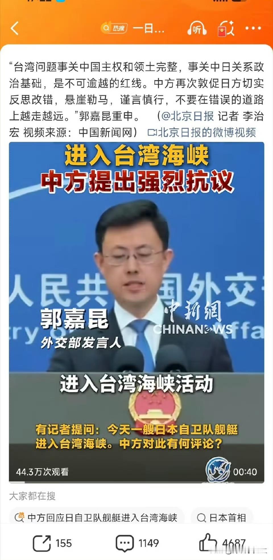 小日子,一个二战战败国,也开着军舰过台湾海峡,居心何在?自不量力!这种不识时务的行为,一定会付出代价的! 当然,我们全程监督管控,它也毫无作为,我觉得就是过来自取其辱! 日本台海动作 无耻小日子