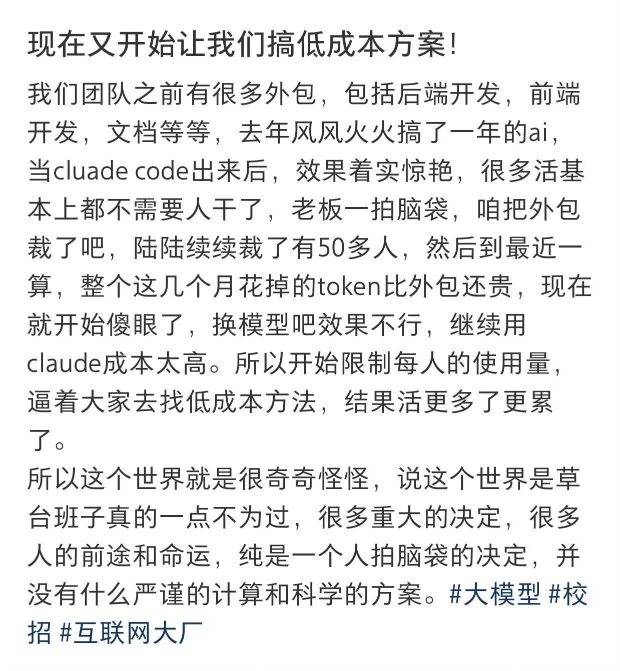 一软件大厂为了节约成本,用 AI 替代。一口气把 50 多个外包码农全部给干掉了。本以为可以节省成本,没想到对 Token 的调用费用相当惊人,成本竟然远超被裁掉的 50 多个人。当初拍板裁人的领导,现在心里慌得一批,可是又没办法回到从前,重新组织招人,这不是要被啪啪打脸?所以发内部邮件要求大家省着用 Token,其他的想办法解决。AI 用着爽,对于企业用户来说,其实费用并不低。对于个人来说做简单的工作或者娱乐都是免费的,但是一旦用户习惯形成,收费是迟早的事情,最终会发现普通人其实 AI 高攀不起。